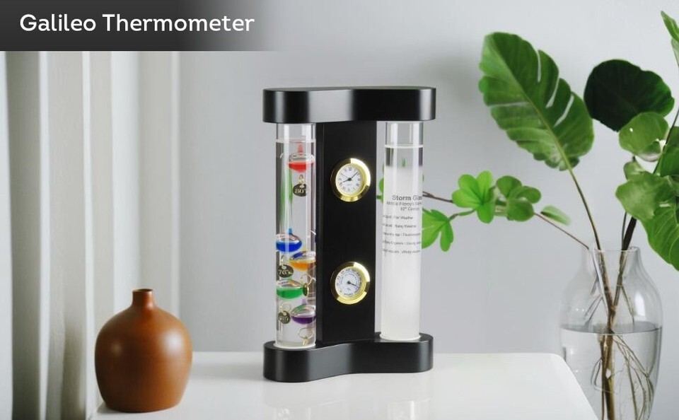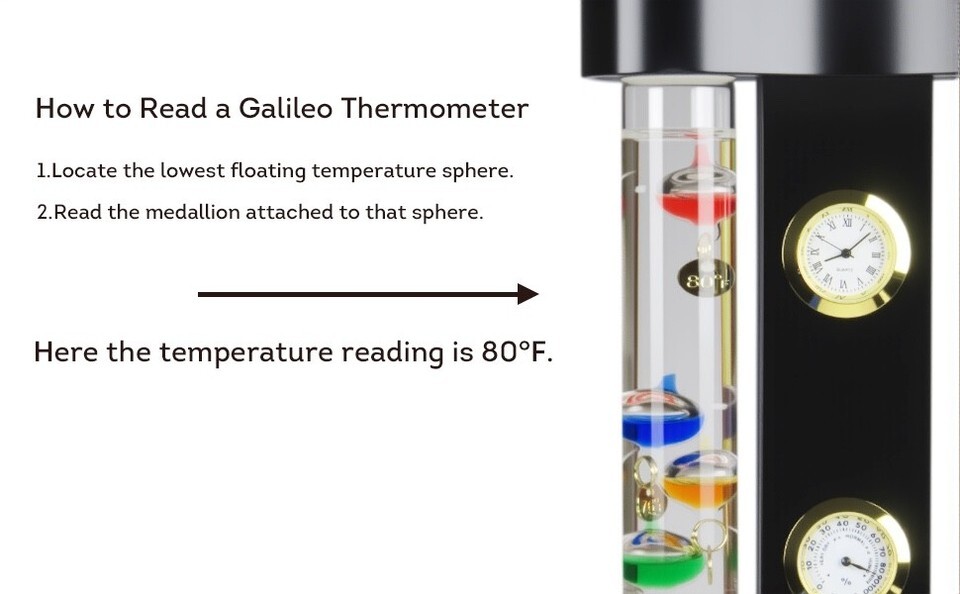 Weather buffs can create their own forecasts and track daily trends with these quality instruments then watch the temperature floaters float up and down the glass tube to determine the current temperature. Our Galileo thermometer shows temperatures of 64 to 80 degrees. Compact size fits on narrow surfaces like shelves, desks, mantels or bedside tables. Measures 7" tall x 4.4? wide x 1.5? deep.