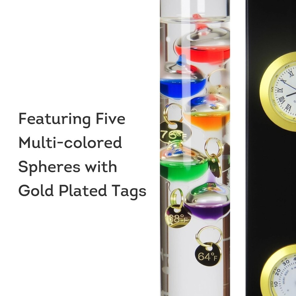 The Galileo Thermometer is a part of the Analog Weather Station from Around The Clock Shop and is an example of utilizing scientific principle to create a useful artistic piece for day-to-day use. Featuring five multi-colored spheres with gold plated tags. This thermometer works best indoors and for temperatures from 64ºF to 80ºF, going up in 4º increments.