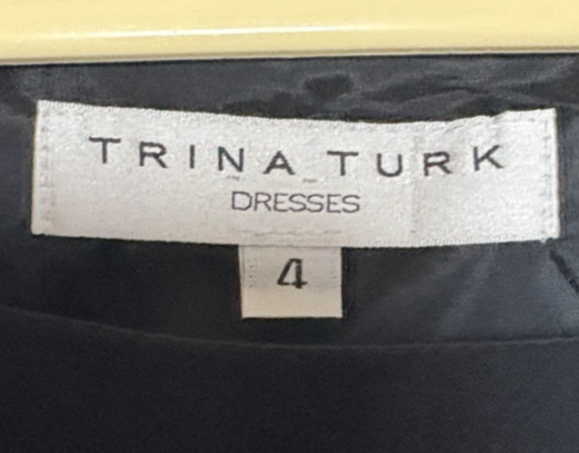 Trina Turk Black Mini Dress with Spaghetti Straps Size 4. Chic black mini dress by Trina Turk. Features spaghetti straps and a ruffled hem. Ideal for casual outings or evening events. This dress is fully lined and zips on the side. The dress is 100% Polyester, and the lining is 95% Polyester, 5% Spandex. Dry Clean Only. Armpit to armpit measures 19?. Shoulder to hem is 34?. Very Good Used Condition - See photos for further description.