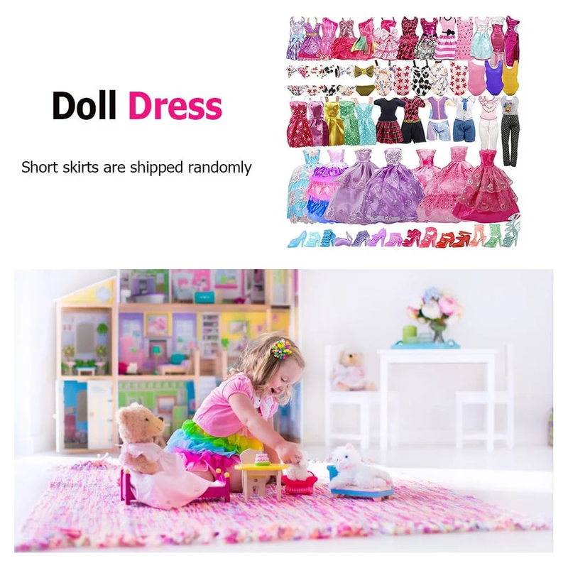 FOR DIFFERENT OCCASIONS: 35-piece clothes satisfy your child's dressing fun. Children can dress up dolls according to different occasions which enriches their imagination UNIQUE VELCRO DESIGN: All doll fashion clothes are carefully crafted by hand and have good quality, ensuring sewing quality. Designed with elastic material and velcro, it is easy to put on and take off for kids' small hands EXCLUSIVE WORKMANSHIP: Designers have done marvelous work for our doll accessories series. We are proud of our unique design and workmanship LASTEST STYLE: We will update the style regularly, but we may not update the picture in time, pictures just show a part of them. Dolls are not included Short skirts are shipped randomly All styles and colors are shipped randomly Skirts, because of the different sizes and specifications of dolls with different themes in different versions, are not guaranteed to be completely suitable for wearing. There is a sticker on the back, so you can adjust it a little sometimes Includes: 5 sets of fashion dresses and skirts, 5 sets of wedding dresses and half-pack dresses, 3 sets of trousers, 3 sets of swimsuits, 4 short skirts, and 15 pairs of shoes Material: Polyester ABS Size: Suitable for 28-30 cm/11.0-11.8" 1 Set x Doll dress Due to the different monitor and light effects, the actual color of the item might be slightly different from the color shown in the pictures Please allow a 1-2 cm measuring deviation due to manual measurement