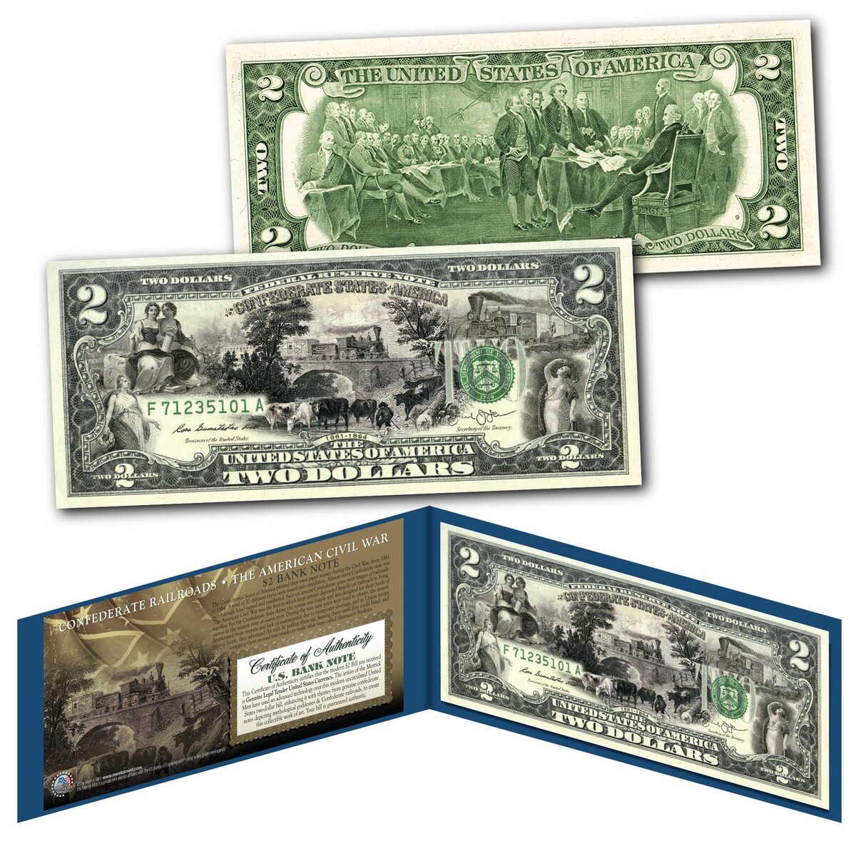 CONFEDERATE RAILROADS Banknote of The American Civil War on Genuine New $2 Bill