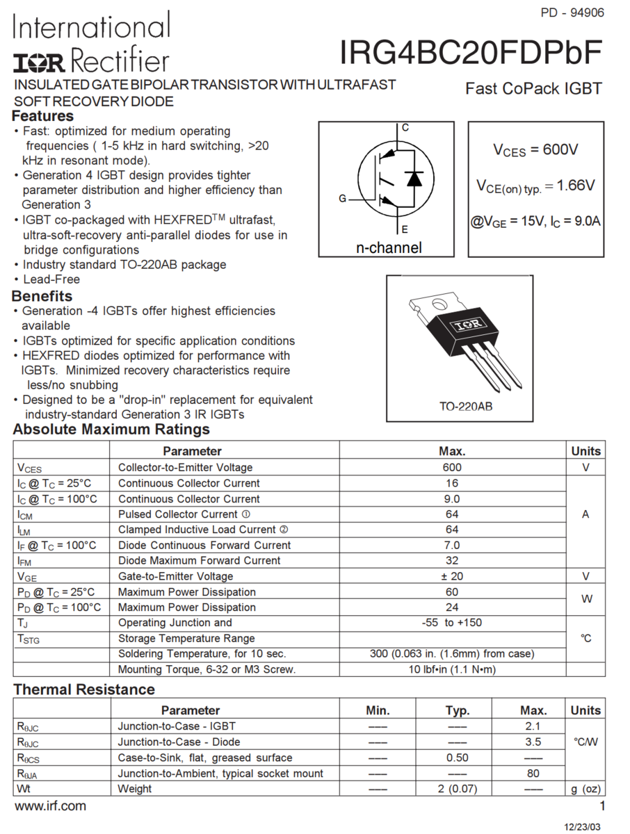 1X IRG4BC20FD International Rectifier IGBT 600V 16A/9A TO-220AB Fast Co-pack Diode