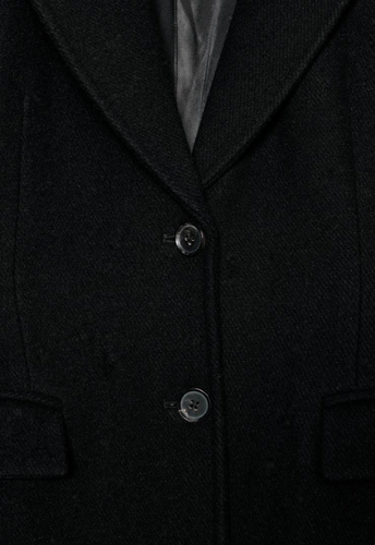 Coat black made from wool yarn. Featuring a lapel collar with a detachable faux fur trim. Long sleeves with vents and buttons. Front flap pockets. Front button fastening.