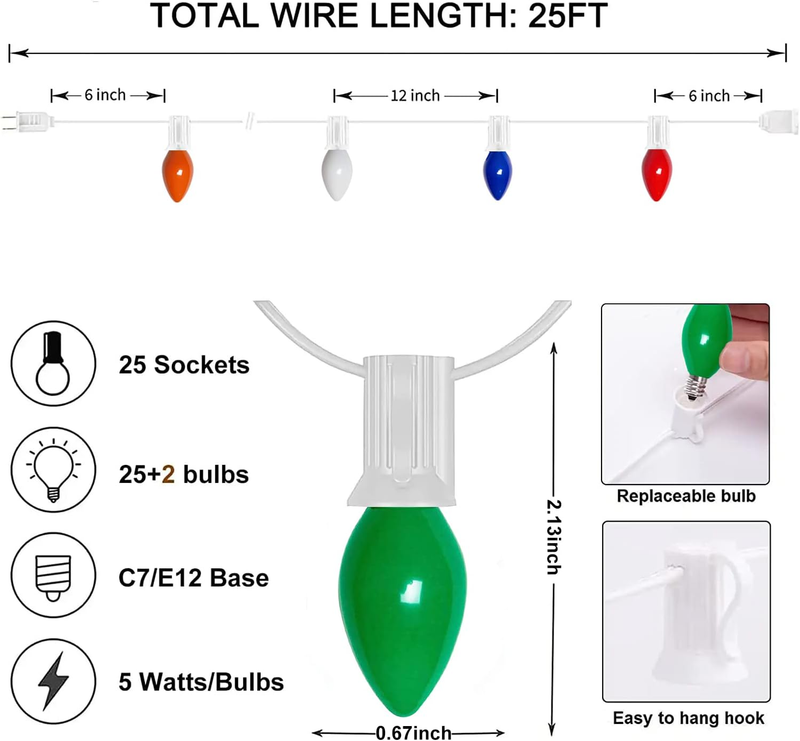 1 X 25FT C7 Multicolored String Light, 1 X 25 Bulbs, 1 X 2 Spare |