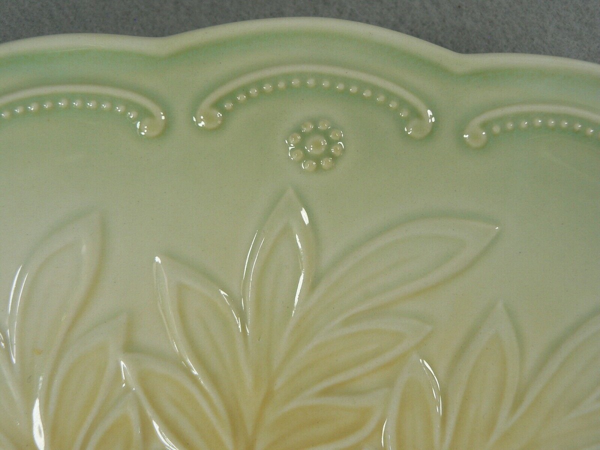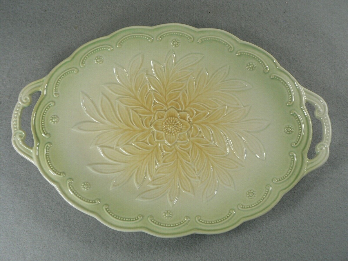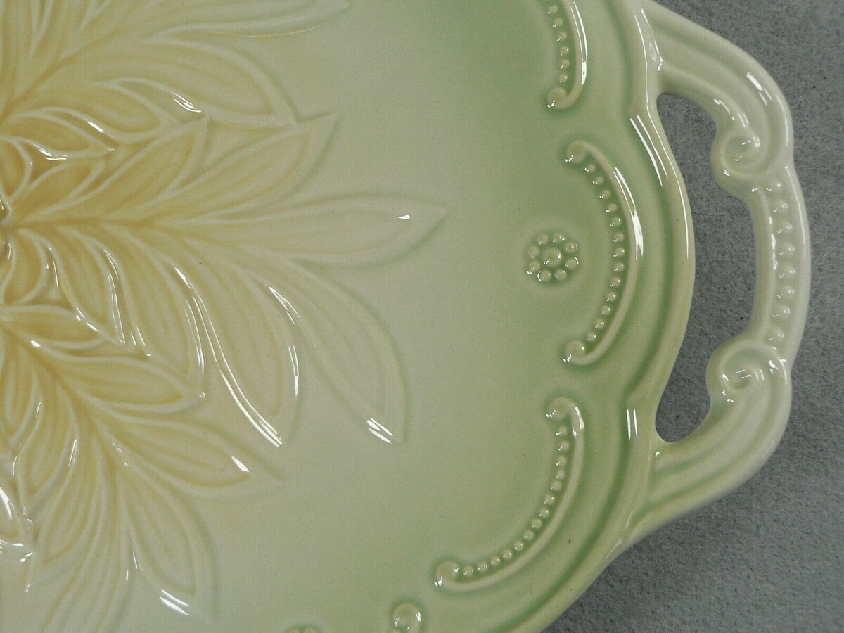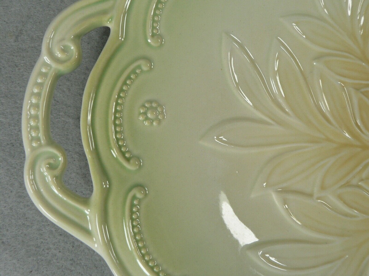 This is a Serving Tray Ceramic with Double Handles Embossed Raised Floral Pattern 12.5"