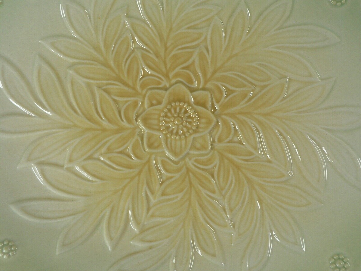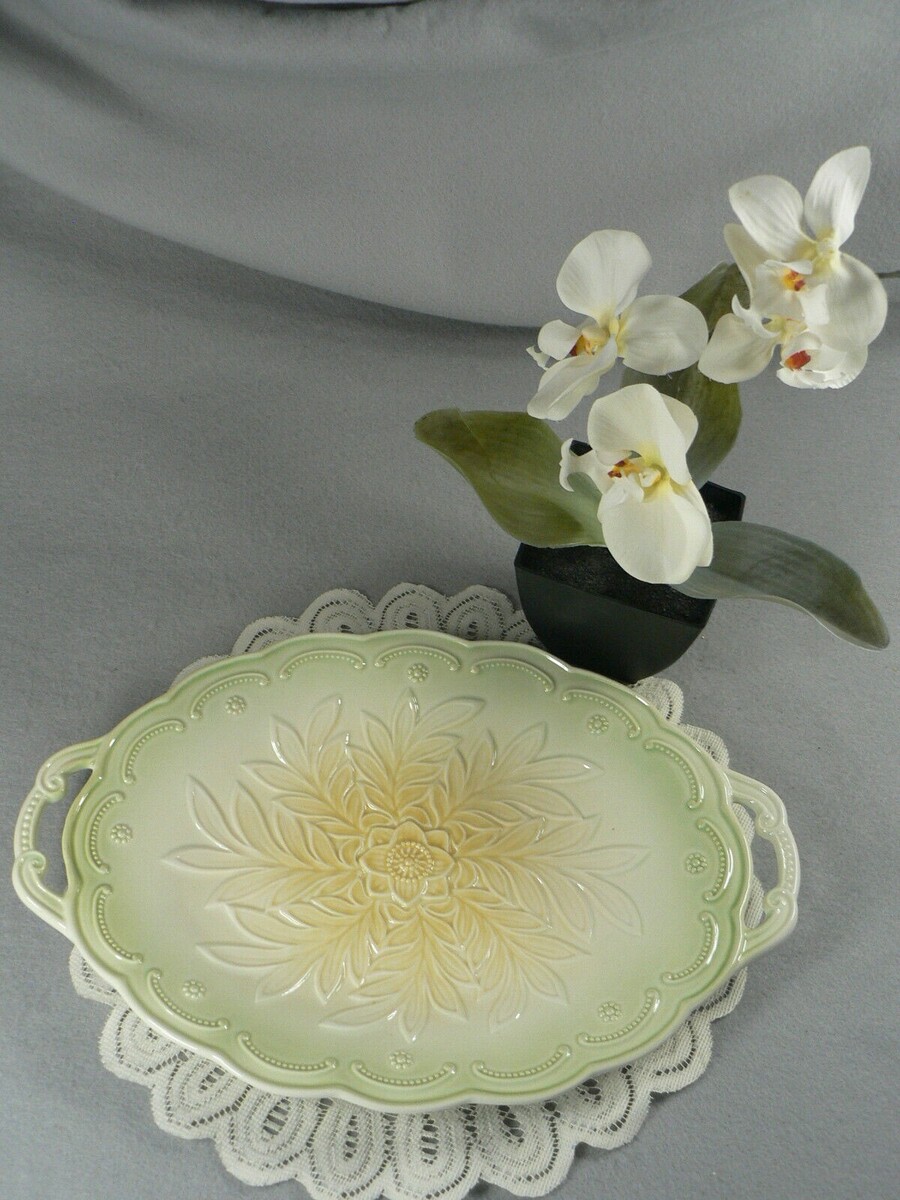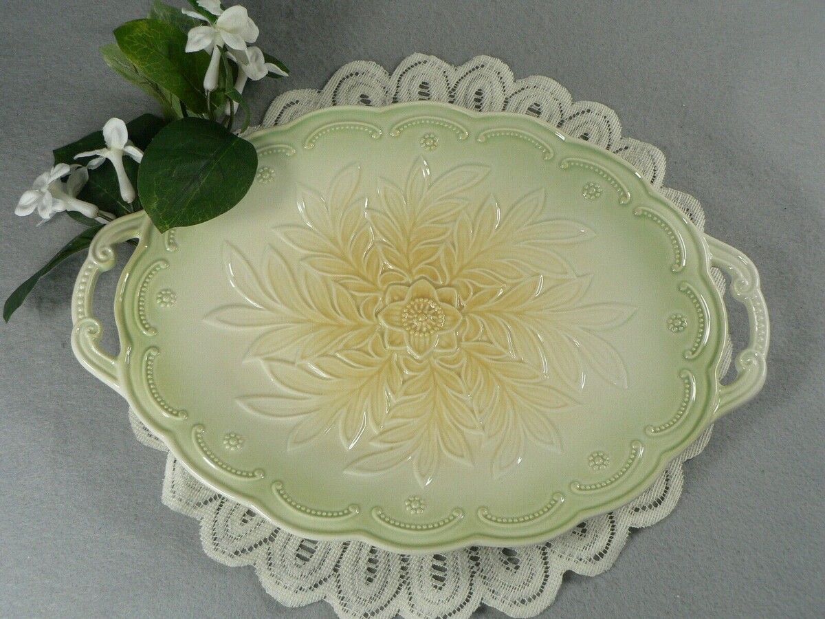 Serving Tray Ceramic with Double Handles Embossed Raised Floral Pattern 12.5"