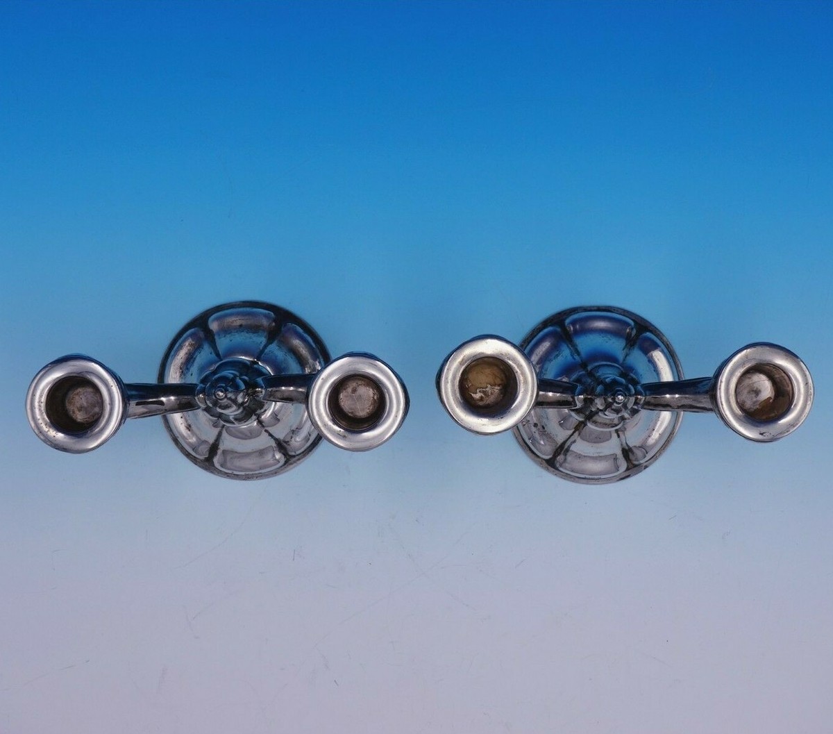 Wonderful German .830 silver pair of two-light candlesticks. The pieces measure 4" tall x 6 1/2" and are weighted. They are not monogrammed and are in good vintage condition.