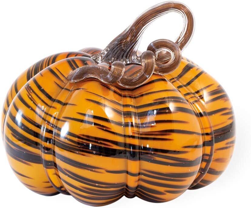 Halloween Holiday CollectionHand Blown Glass PumpkinTiger PrintMaterial: GlassItem #: FEI9307Measures: 9 L X 9 W X 7 H DECORATIVE PUMPKIN: Handblown glass pumpkin crafted with great careDIMENSIONS: Vertical style measures 9-inches in diameter, 7-inches tallARTISAN DETAIL: Orange pumpkin with tiger stripe pattern, accented with coiled stem; dust with a soft clothHARVEST CHARM: Color scheme is ideal for autumn and Thanksgiving decorating; place on a on a shelf, mantel or tabletop surface as part of a centerpiece arrangementCELEBRATE THE HOME: Enhance the beauty of your indoor and outdoor spaces with kitchen, garden, and home decor