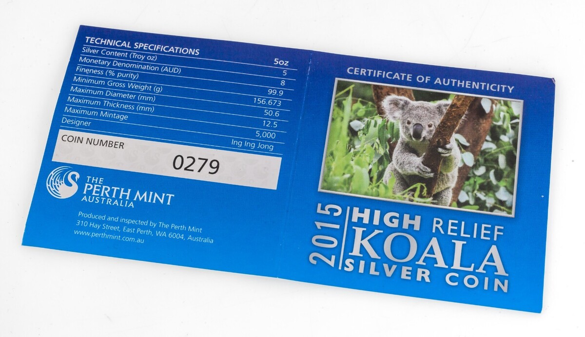 2015-P Australien 5 Oz. 8 S$ Silber-Koala-Hochrelief NGC PF70 Ultra Cameo CoA