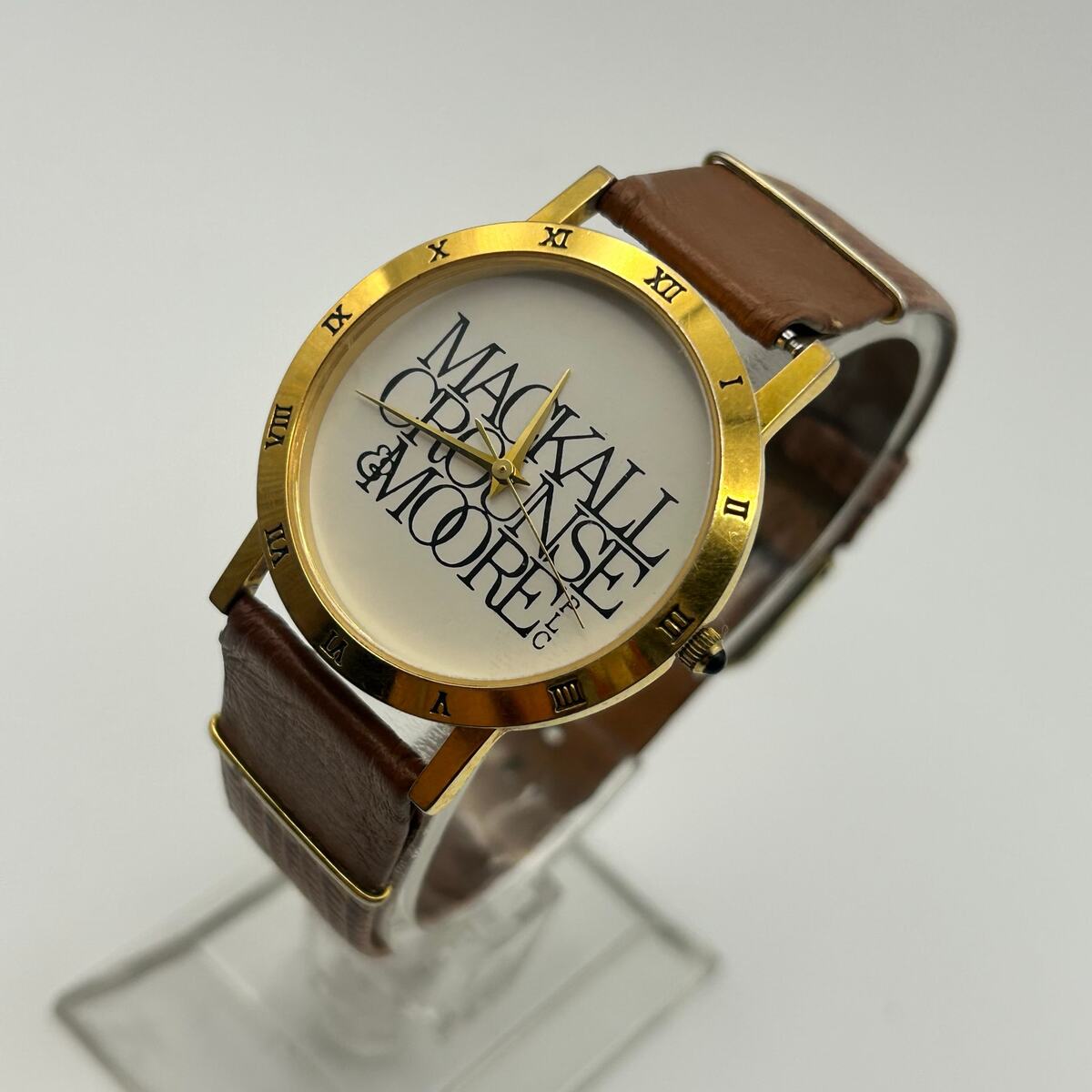 This is a beautiful Mackall Crounse Moore women's watch that features a gold and brown design. It's in great working condition and has a new battery, so it's ready to wear right away!