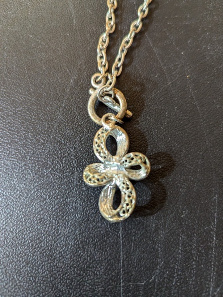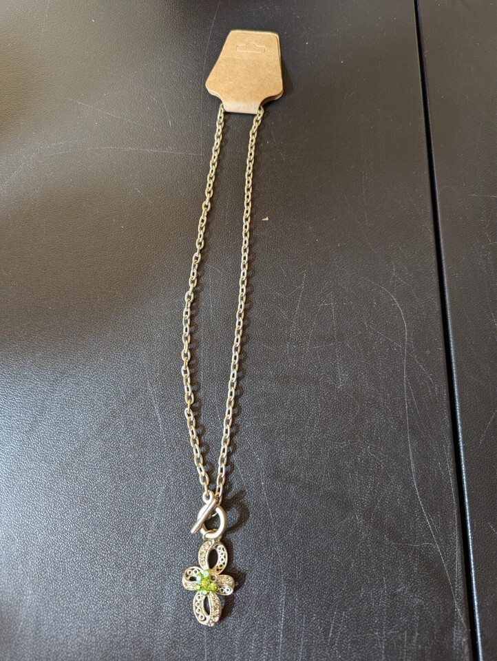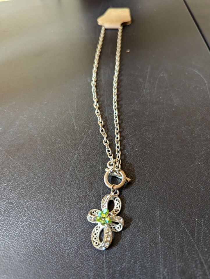 silver tone fashion 9" necklace with siler tone ribbon pendant w/ clear and gree