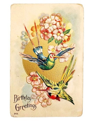 1900s Birthday Greeting Card Postcard Hummingbirds Gilded Embossed Ephemera E83C