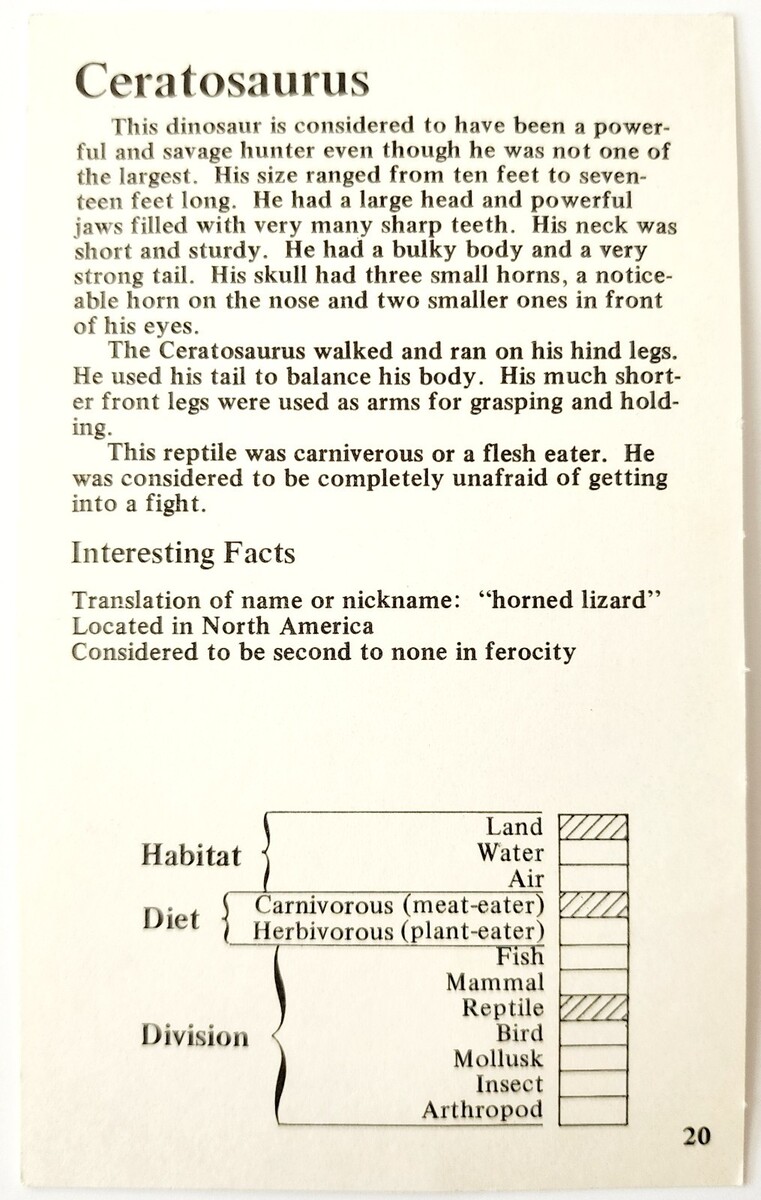 1975 CERATOSAURUS Dinosaur Card Vintage Prehistoric Illustration Ephemera B78A