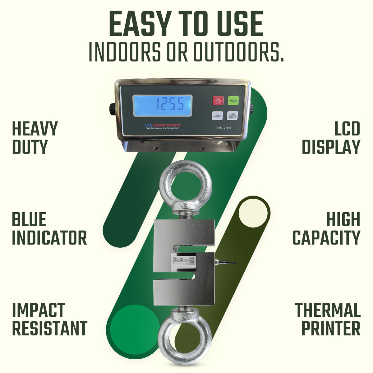 The USA Measurements US-CSK comes with everything you need to quickly set up and start weighing items. The kit includes our US-7011 indicator, an S-type load cell, two eye hooks, a power adapter, AAA batteries, and a user manual. The S-type load cell features an 11' braided cable and alloy steel construction, along with standard 1/2" 20 thread eye hooks for secure connections.Specifications:Capacity 3,000 lbAccuracy 0.5 lbSize: 8.5? x 9? x 2?Load Cell Material: Alloy SteelCable Length: 11?LB/KG SelectableTare Range: Full CapacityPower: AC Adapter or BatteriesOptional Thermal PrinterWarranty: 1 YearNon-NTEP (Not legal for trade) What?s Included: (1) Top Eye Hook(1) Bottom Eye Hook(1) Tension Load cell(1) LCD Bright Digital Display(1) Manual(1) Factory Calibration Models: US-CSK-1K Crane Scale 1,000 lb x 0.1 lbUS-CSK-2K Crane Scale 2,000 lb x 0.2 lbUS-CSK-3K Crane Scale 3,000 lb x 0.5 lbUS-CSK-4K Crane Scale 4,000 lb x 0.5 lbUS-CSK-5K Crane Scale 5,000 lb x 0.5 lbUS-CSK-10K Crane Scale 10,000 lb x 1 lbUS-CSK-20K Crane Scale 20,000 lb x 2 lb Resources: US-7011 Owners Manual https://youtu.be/tVu7KLCrYKo?si=RrTrun6H3iO-oieQ