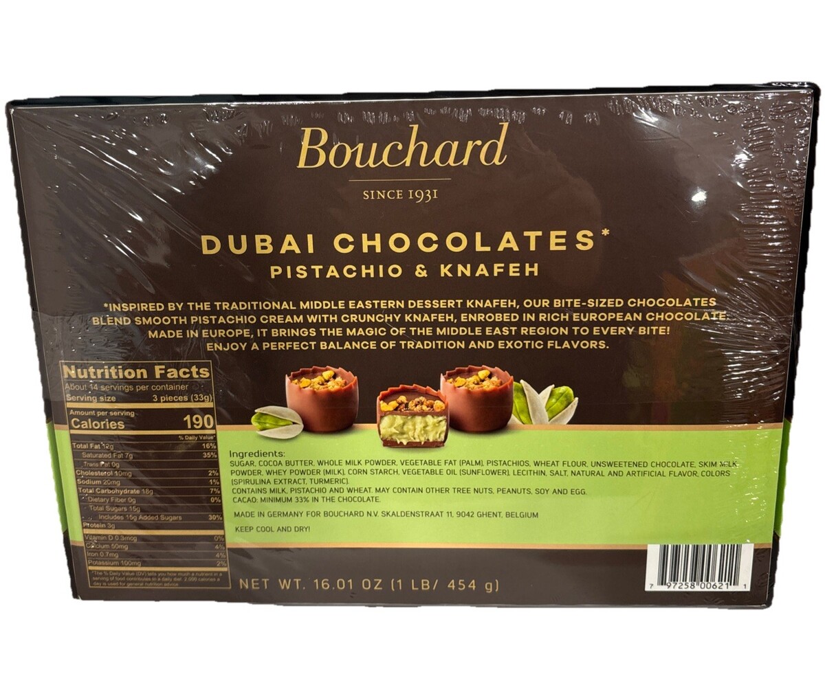 The Bouchard Dubai Chocolates Pistachio Knafeh is a luxurious assortment of 41 pieces, weighing 16.01 oz, perfect for the Christmas season. This chocolate sweet and assortment from the renowned brand Douchard features a pistachio flavor, making it a unique and delicious treat. Each serving size of 33g contains 190 calories and comes in a beautifully packaged box, representing the rich culture of Dubai chocolate. Made in Germany, this milk chocolate treat is a delightful indulgence for anyone with a sweet tooth.