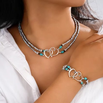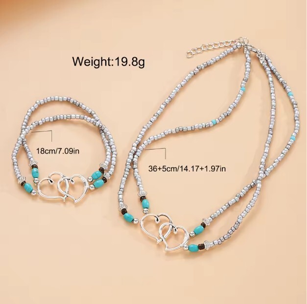 2 Piece Set Bohemia Turquoise Heart Bracelet Necklace