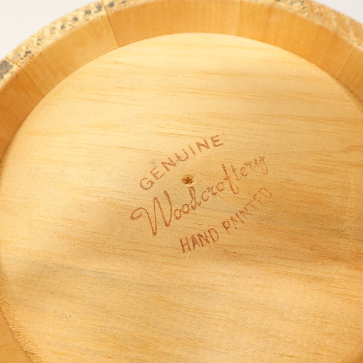 Add some rustic lodge charm to your bar or cabin decor with this vintage Woodcrafters hand-painted wooden ice bucket. Made in the USA and marked ?Genuine Woodcrafters ? Hand Painted,? this solid wood bucket features a classic pinecone and green ribbon design all around with a removable lid and side handles.