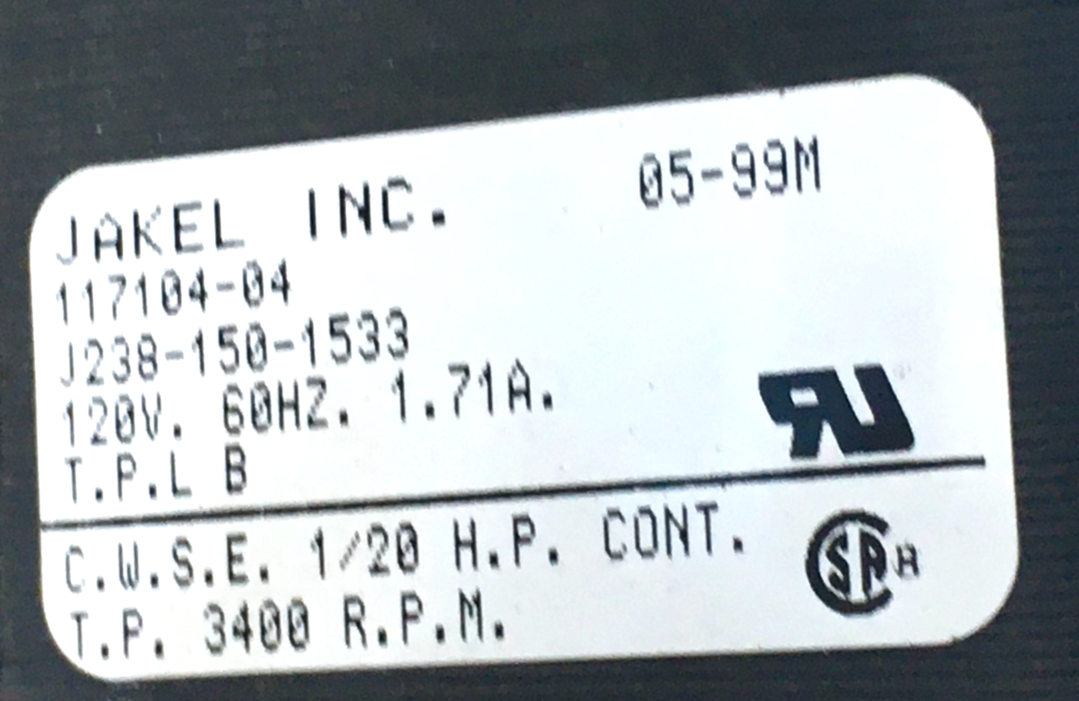 This is JAKEL 117104-04 DRAFT INDUCER BLOWER J238-150-1533 120 V 1/20 HP 3400 RPM used part.