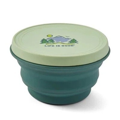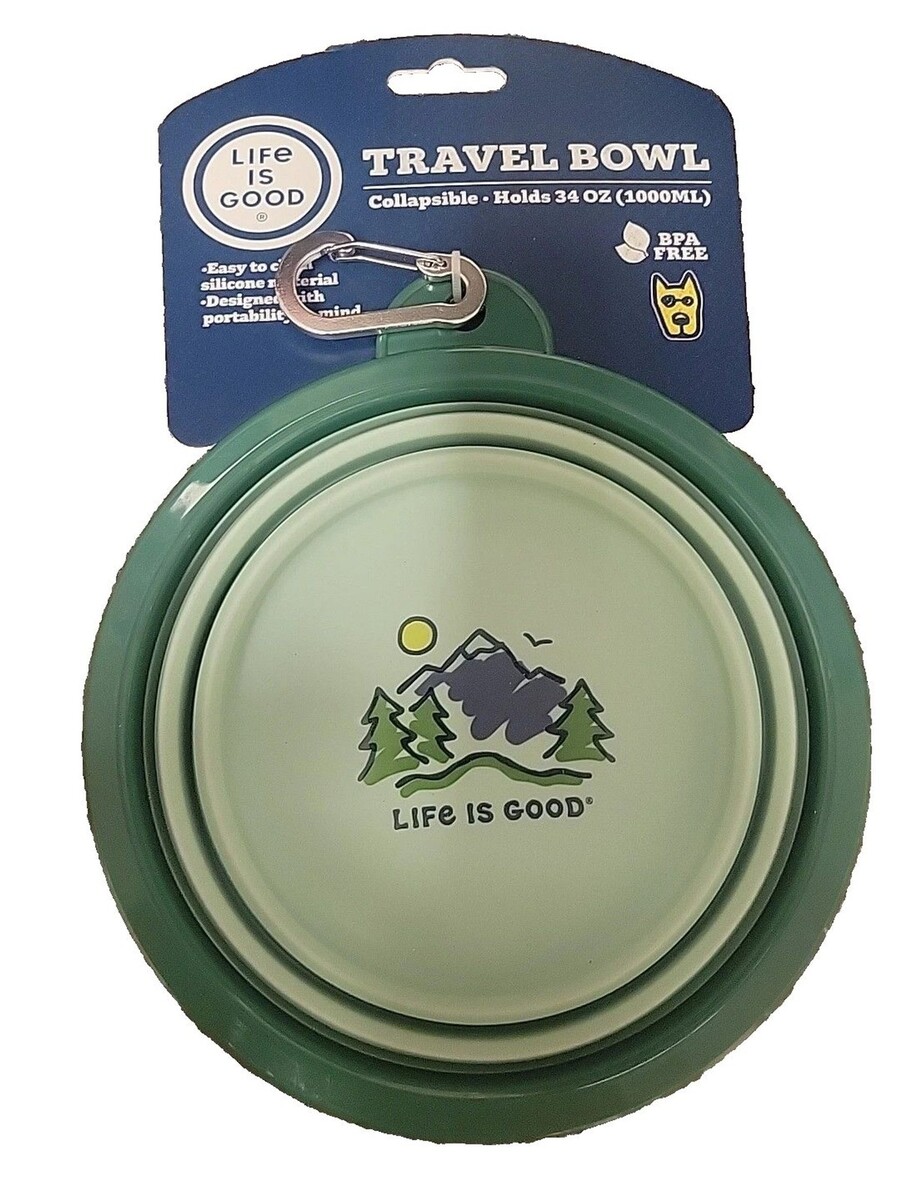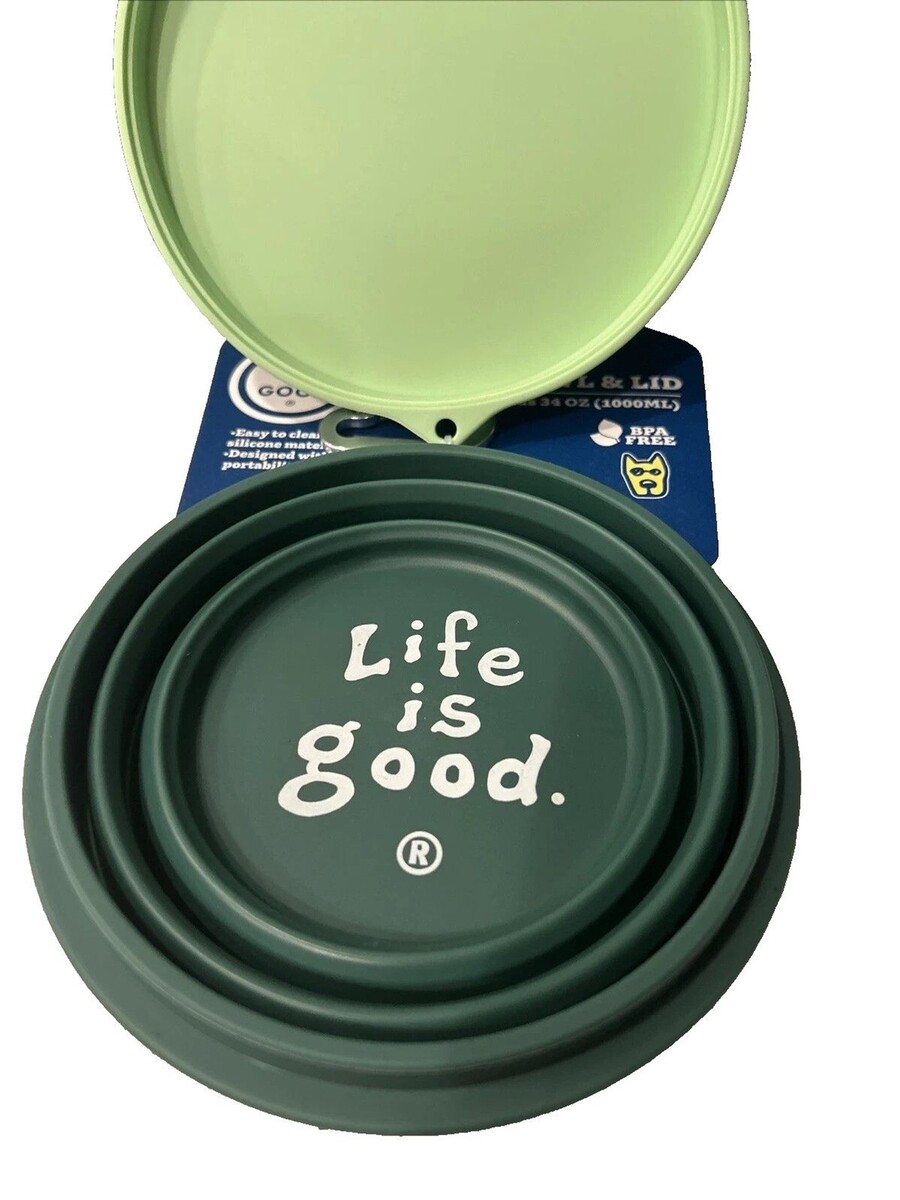 Life is Good Dog Collapsible Bowl Lid Water Food Travel 34 oz Silicone Green NEW