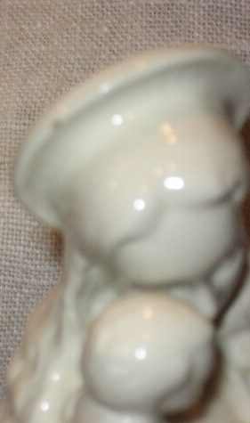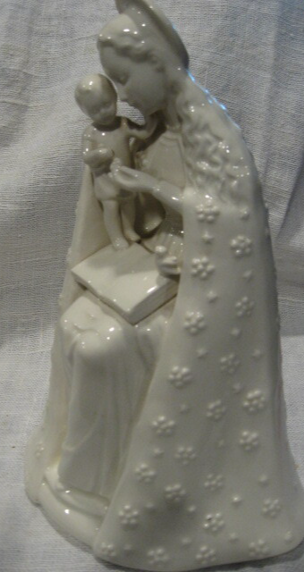 It feels like we've come upon a tender mother child moment. Figure is tenderly holding her standing child and is sharing an open book on her lap. Many other details: tiny bird, halo, cascading long hair, raised flower design on her cape. Artist's name MJ Hummel appears on the back bottom of cape. Finish is high gloss ivory. Maker's mark is stamped in blue ink and indicates Germany and shows the "full bee". This figure was manufactured 1950-1959. Stands 9" tall X 6" base. There is the tiniest of a chip on the edge of the halo. Refer to Photo # 5 No other flaws or crazing. Look for other religious themed items in my booth.