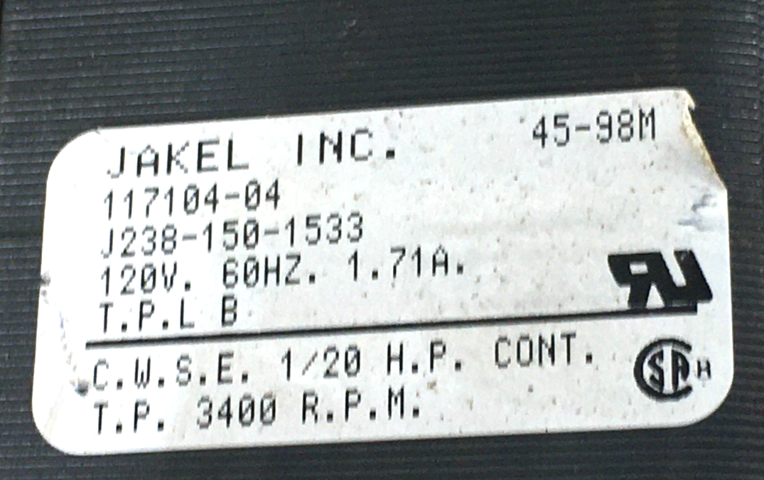 This is JAKEL 117104-04 DRAFT INDUCER BLOWER J238-150-1533 120 V 1/20 HP 3400 RPM used part.