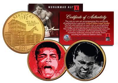 Here is your chance to own an Officially Licensed complete set of two (2) 24KT Gold Plated and colorized 2001 Kentucky Statehood Quarters U.S. Coins featuring the pop art of Joe Petruccio in this Limited Edition MUHAMMAD ALI Coin Set. These high-quality, genuine Legal Tender United States coins have been layered in Genuine 24 Karat Gold, and then colorized using a unique painstaking multicolor authentic process by the Merrick Mint. Colorizing coins involves the unique application of special inks directly to the surface of a coin that achieves a level of detail, color saturation, and durability that is #1 in the coin industry. The result is an everlasting colorized coin collectible of ultra-high quality. Each 24KT Gold Plated coin features an emblematic design of Kentucky State on the reverse and colorized images of MUHAMMAD ALI on the obverse (portrait of George Washington design). Each coin comes in a premium coin capsule. The 2-coin set comes with a Certificate of Authenticity to guarantee that your coin is authentic and recognized by every monetary authority around the world, assuring its Collector Edition status.