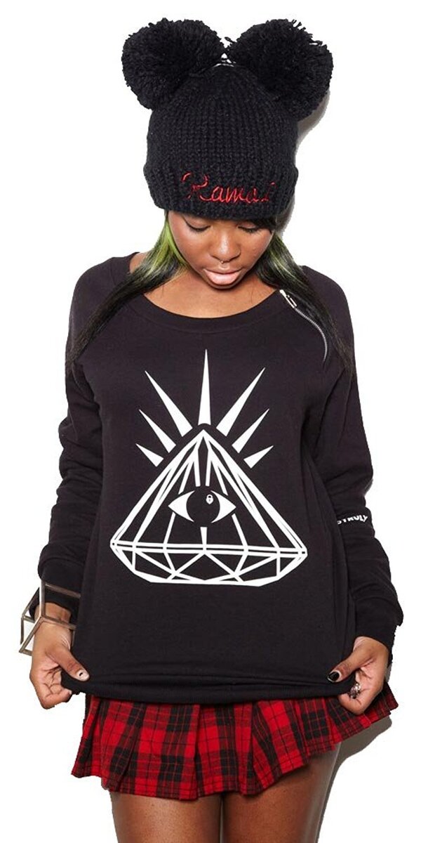 Questo e per un nuovo di zecca con tag il tuo maglione da donna Diamond Eye Women's Crew Cerniera diagonale spalla Fleece 100% di peso leggero in cotone Neck Wide Crew Nero con occhio di diamante bianco Realizzato in Cambogia Abbigliamento autentico
