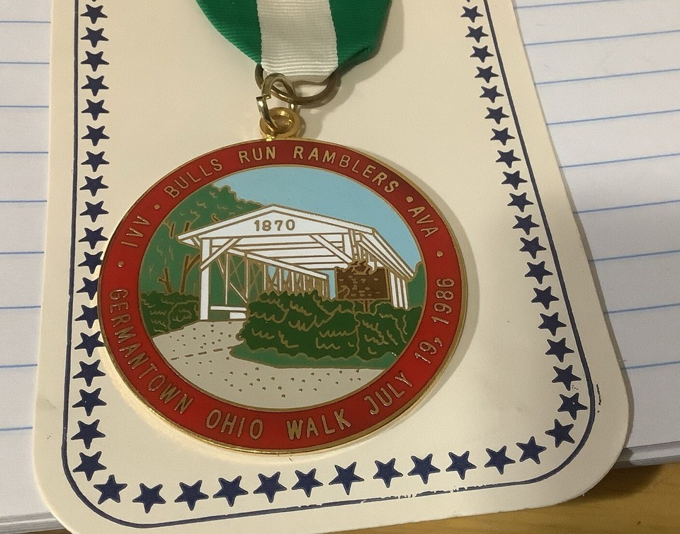 1986 Volksmarch award from the Bull Run Ramblers, Germantown Ohio. Metal enameled covered bridge on a green and white striped grosgrain ribbon with pin. Still on cardback. Feel free to email with questions. I do combine shipping on multiple items. Have a great day!