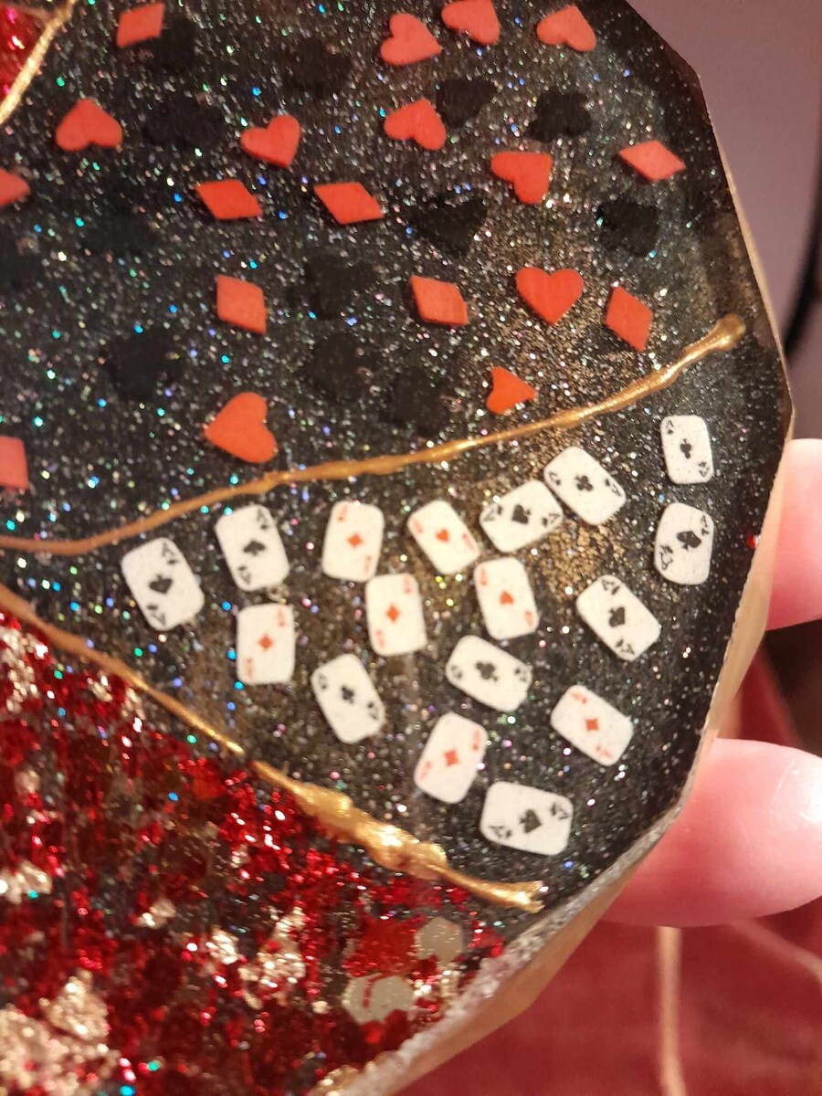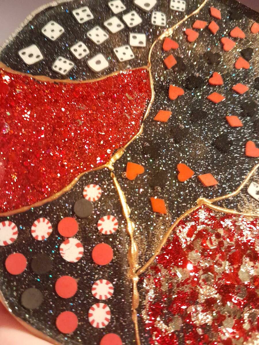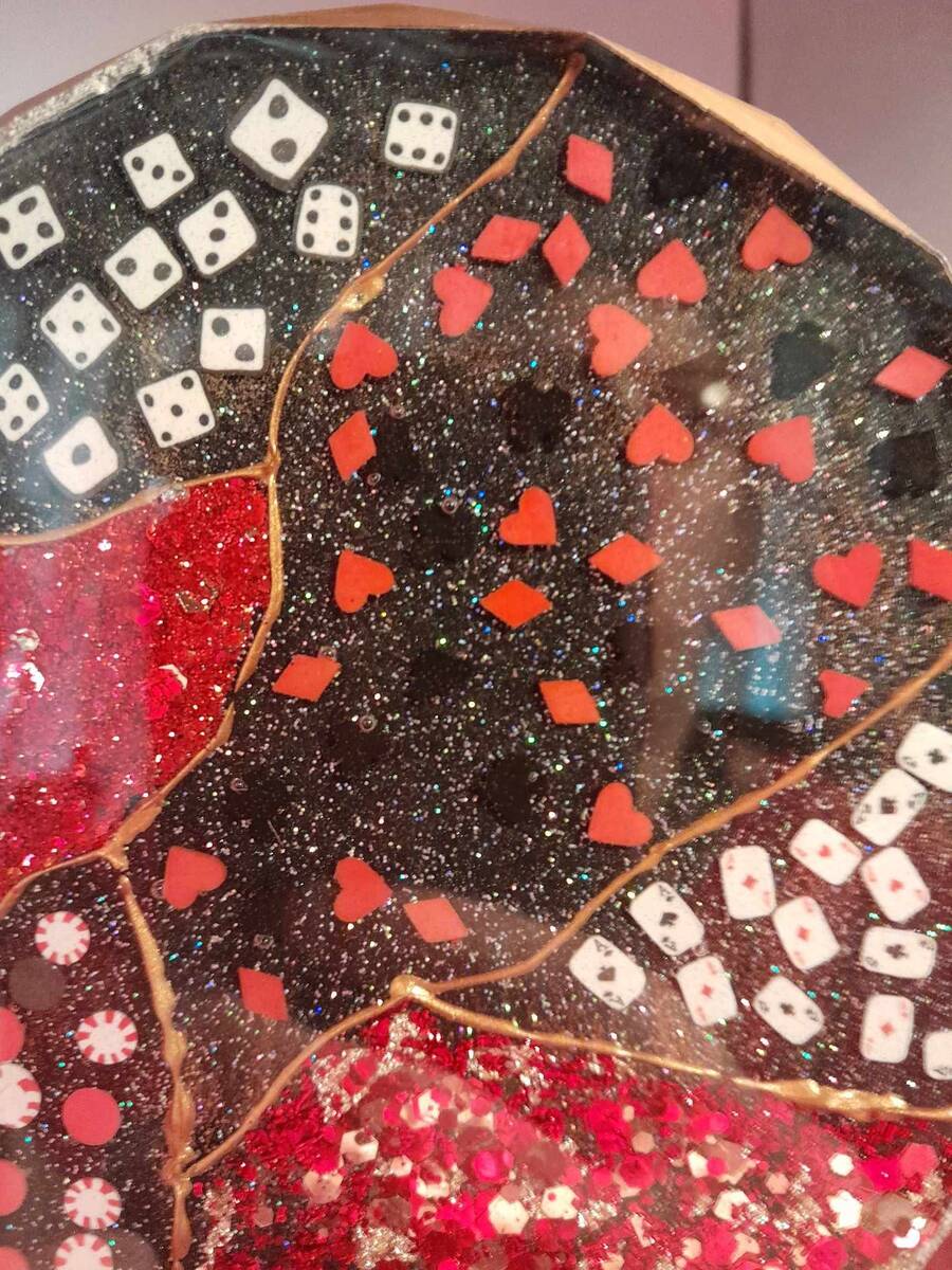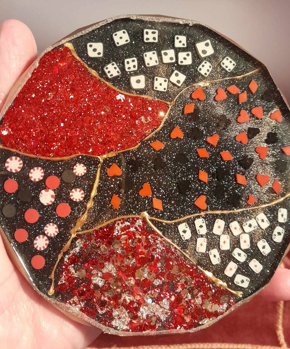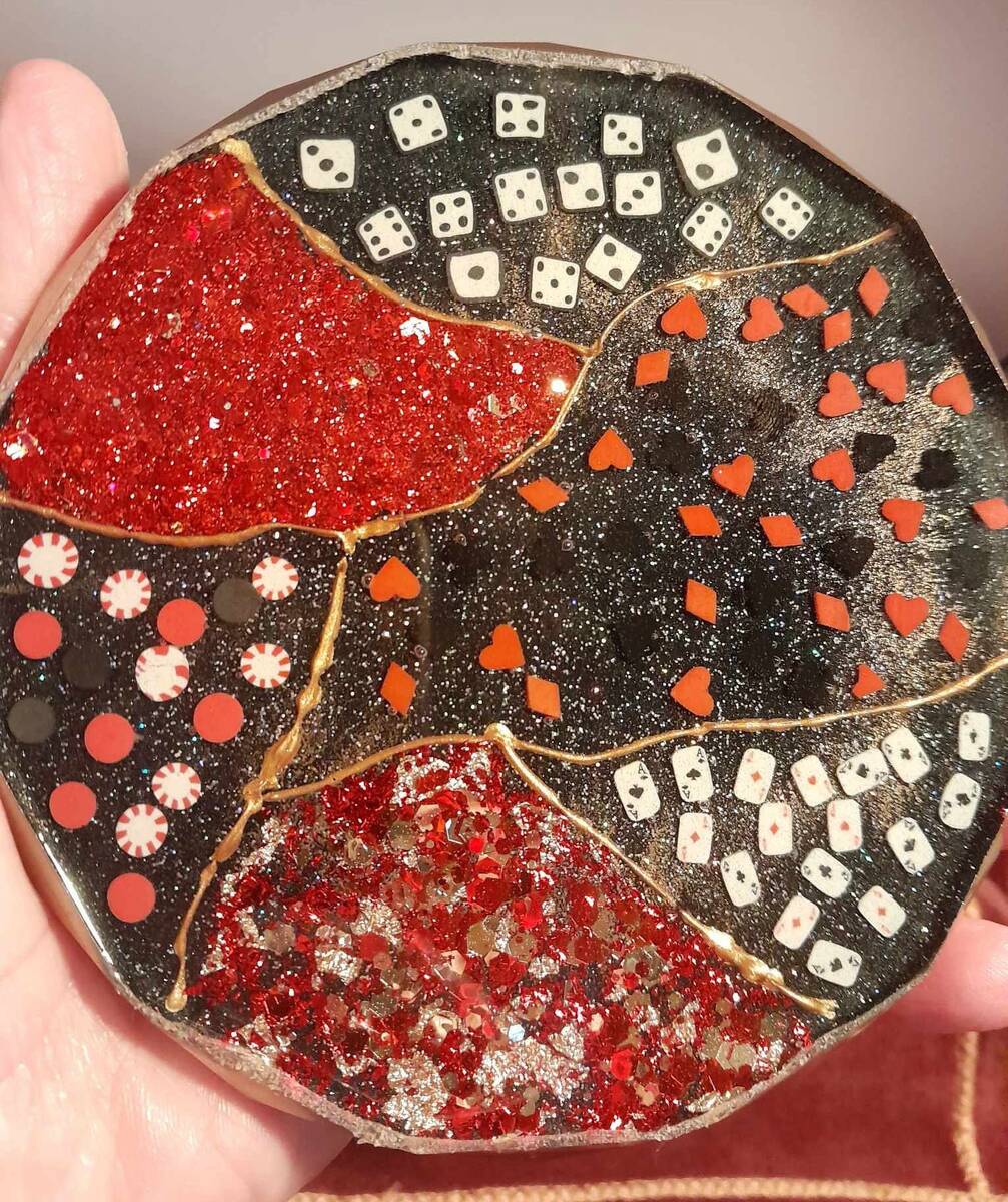 Who's feeling LUCKY? This large Coaster has it all. Cards, Dice, Chips, Hearts, Diamonds, Spades, Puppy Feet! Perfect gift for those who love Cards, Gambling, Games, Casinos. Unique and handmade.