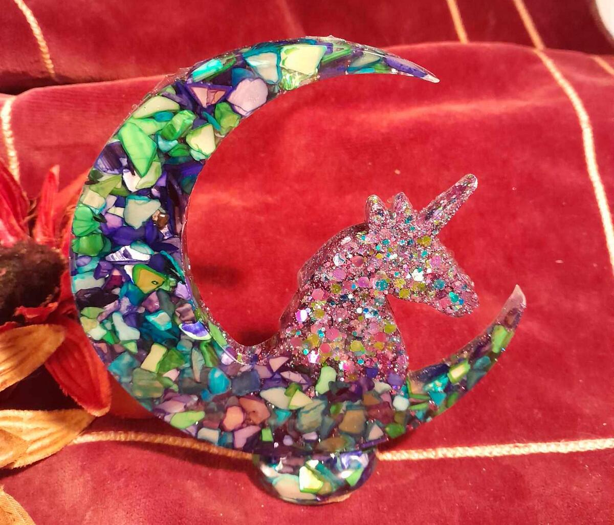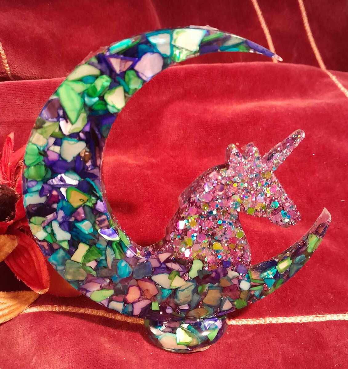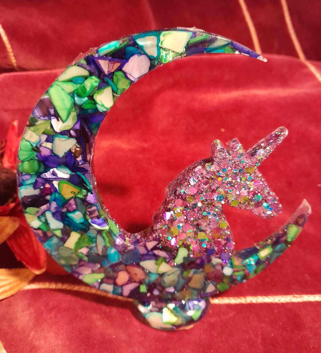 Gorgeous chunky glitters of purple, blues and greens fill this magical Unicorn who is perched on a crushed shell filled Crescent Moon. Nice simple piece, and mixed media fun!