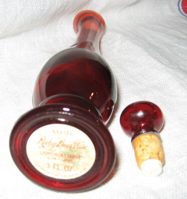 Another very collectible Avon bottle. This ruby red bud vase and orignal stopper will look terrific no matter where it is displayed. Slender neck and flared base. Has original Avon label on the bottom. Once held "Unforgettable" which launched in 1965. A whiff of scent remains! Measures 8.25" T with stopper. Look for other Avon items in my booth.