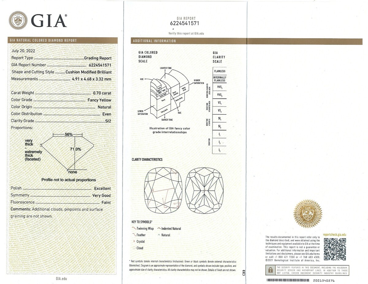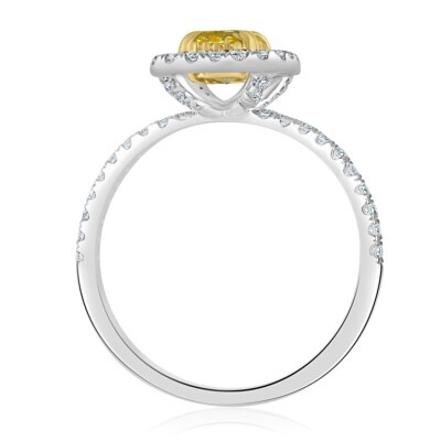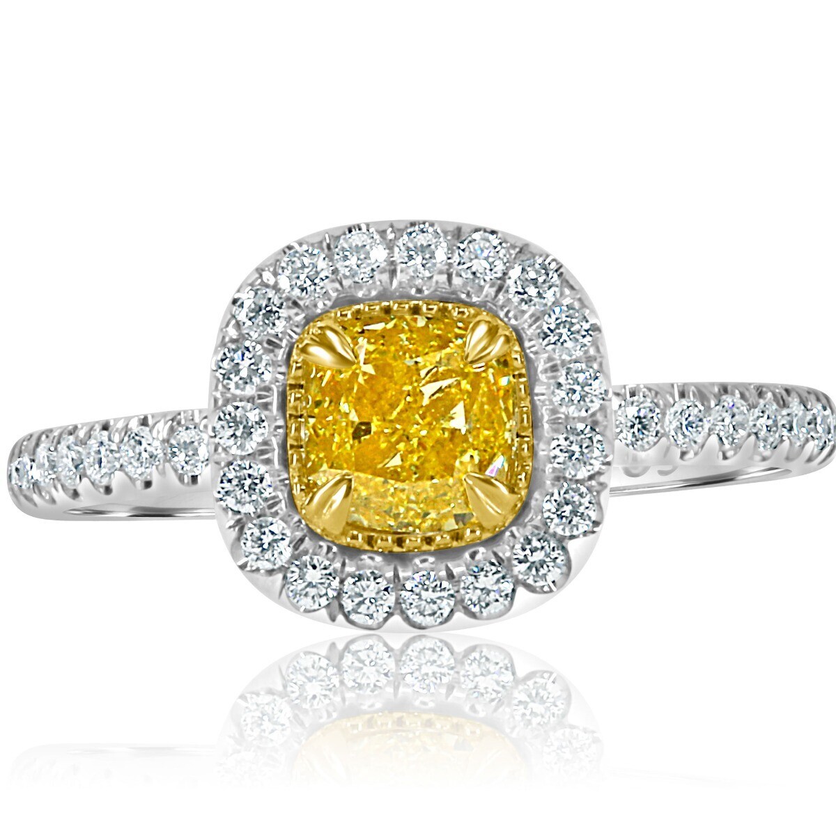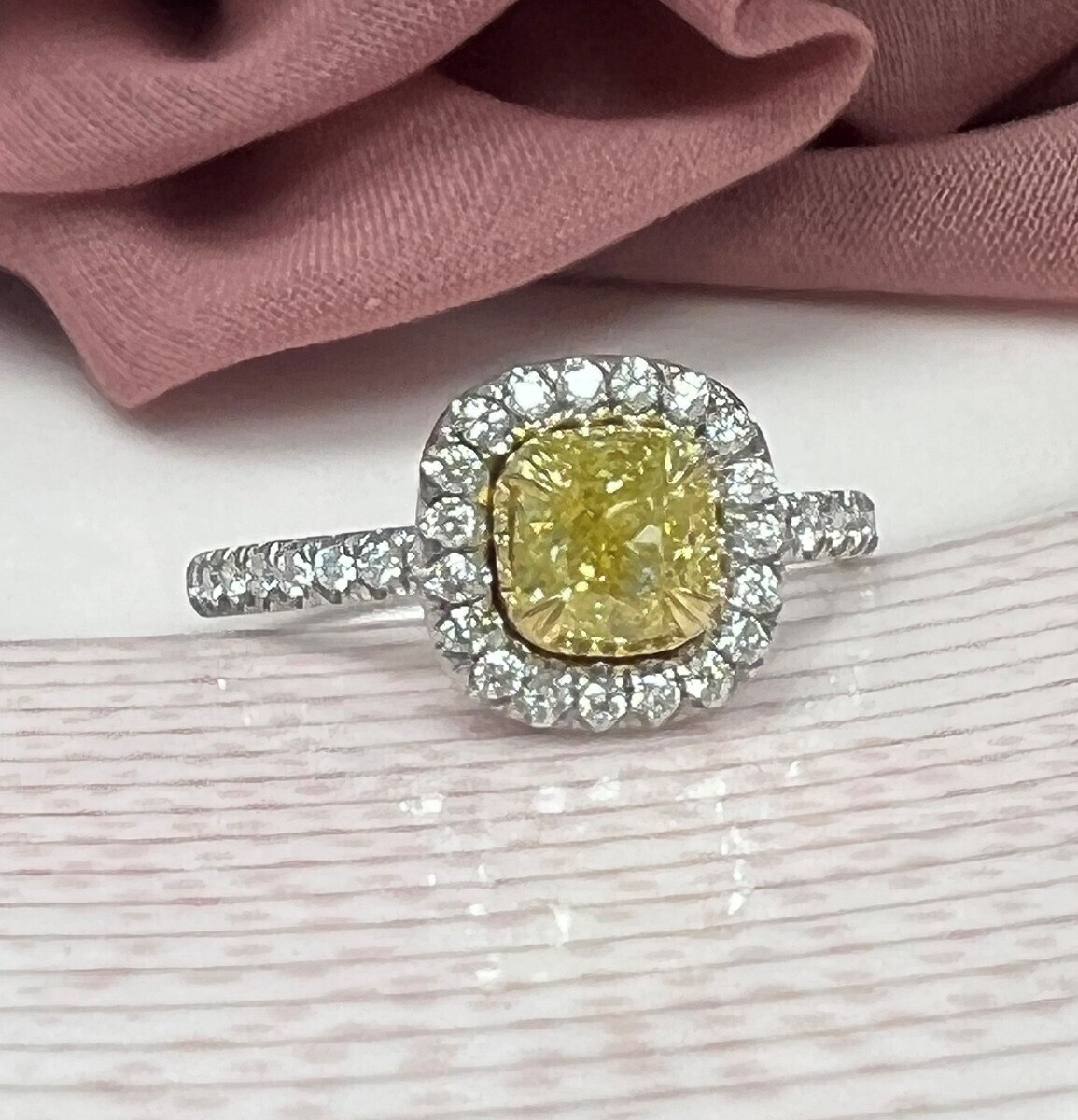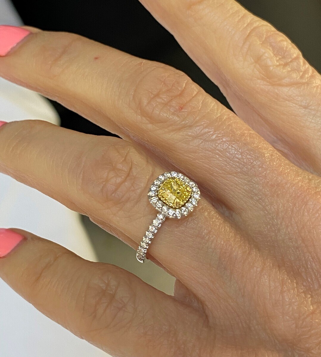GIA Certified 1.18 Ct Cushion Natural Fancy Yellow Diamond Ring 18k White Gold