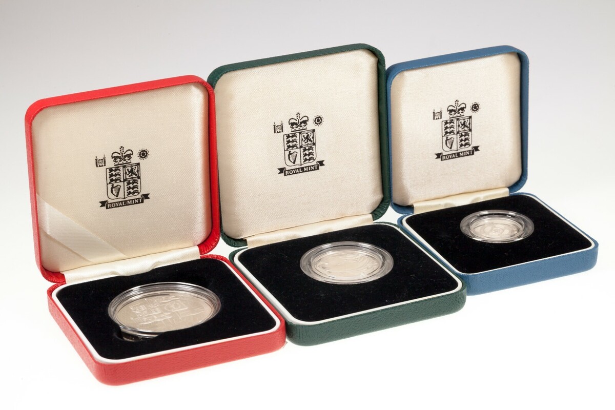 1995-1996 Großbritannien 1, 2 und Kronenmünzen in Silber, Polierte Platte, 3er-Lot