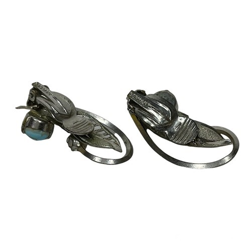 Vintage Silver Tone Leaf Teal Stone Clip On Earrings Boho Retro Germany Earbobs