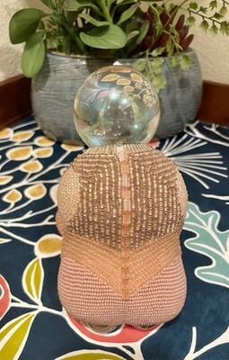The product is a beautifully crafted ceramic beaded woman figurine statue sculpture, adorned with Iridescent art glass balls. This decorative collectible is signed by the artist, adding a unique touch to its charm. Signed SVS '16.