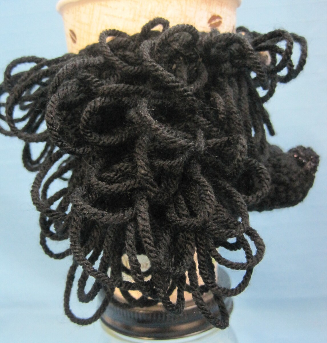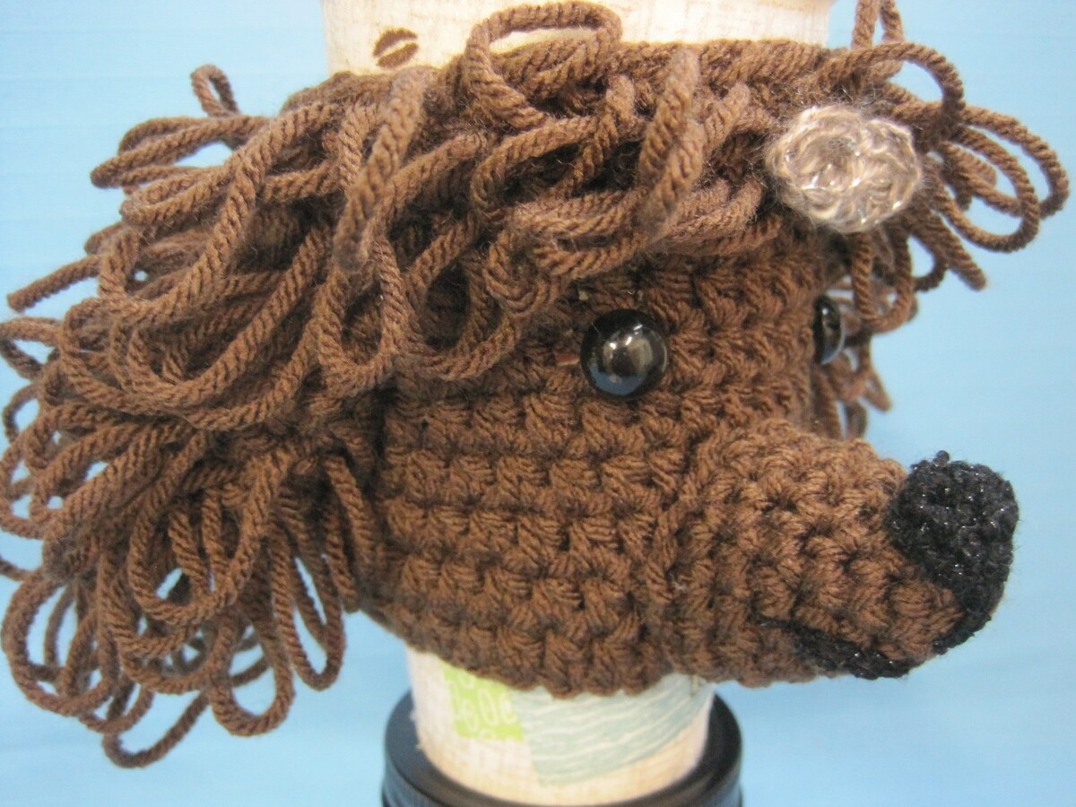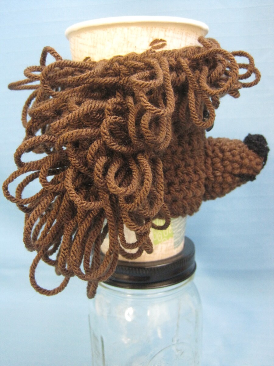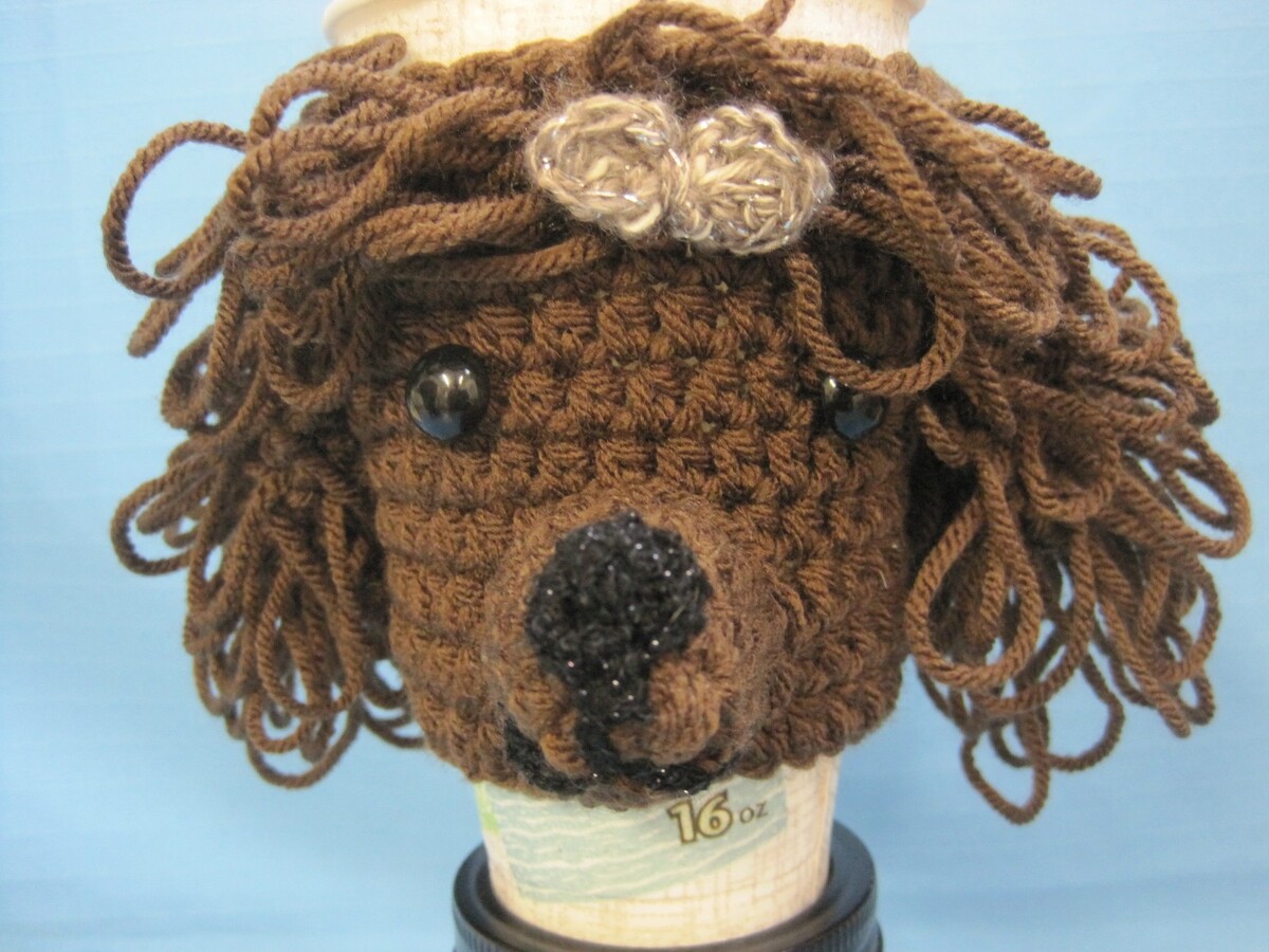 ? This product is a handmade crochet poodle puppy cup cozy, featuring a tapered shape and a variety of colors including white, black, brown, silver, and red.