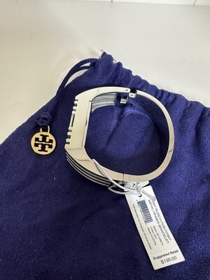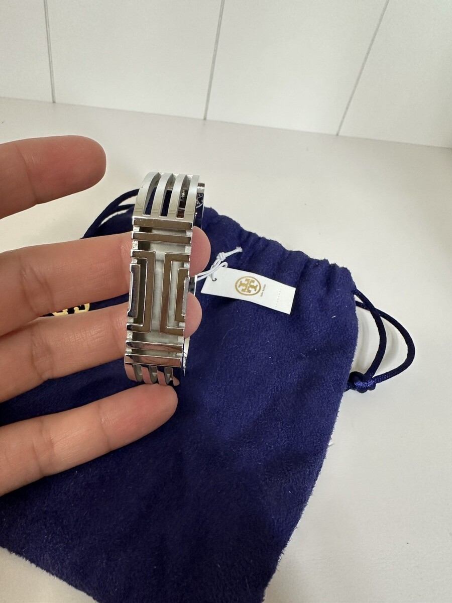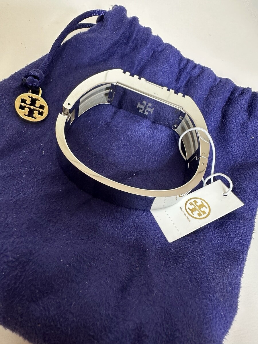 The product is a new Tory Burch hinged bracelet in silver, designed specifically for Fitbit users. It comes with tags and a dust bag, making it a stylish and practical accessory for those who both love fashion and fitness. The bracelet combines the high-quality craftsmanship of Tory Burch with the functionality of Fitbit, offering a unique and chic design for those who appreciate both style and performance.