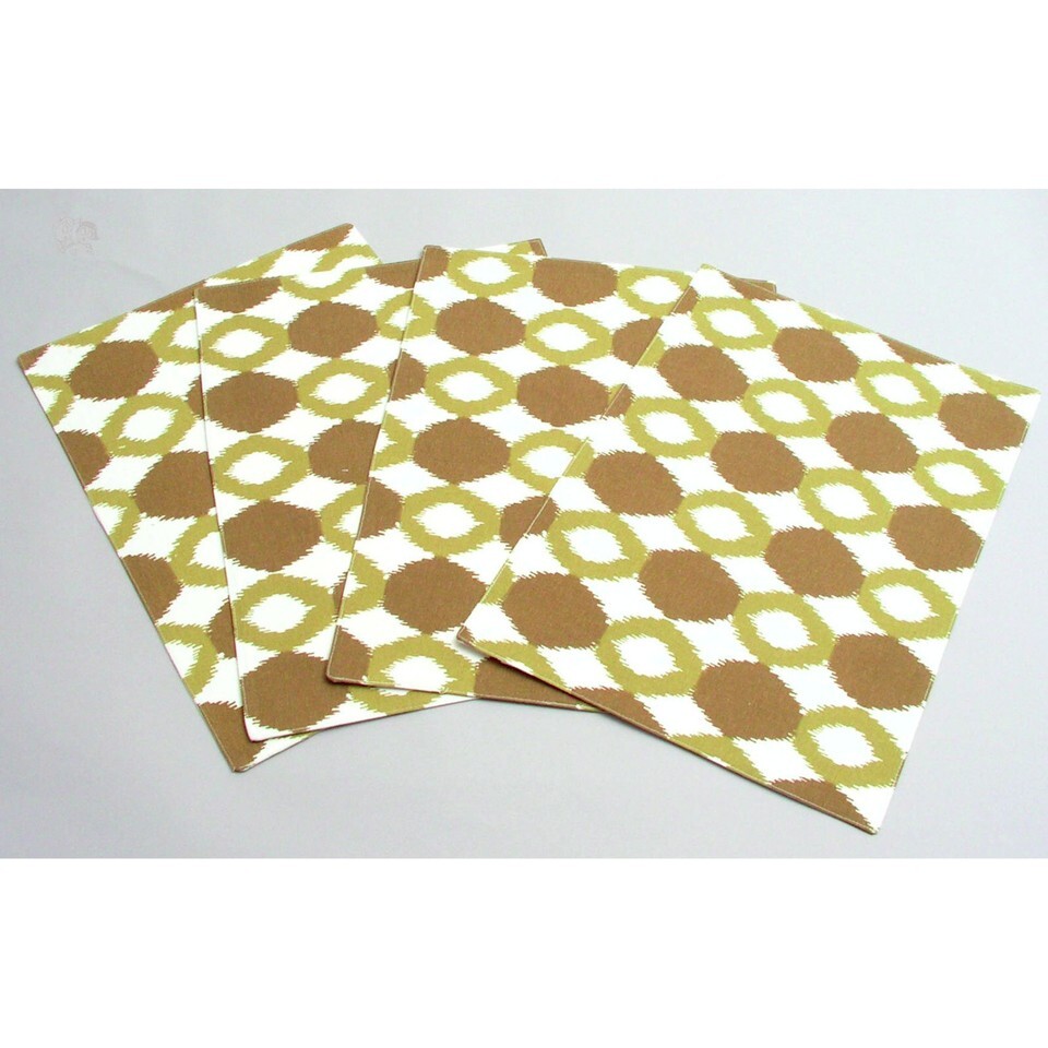 Set of 4 place mats. Mosanique Ikat Collection. Design inspiration in chartreuse. A beautiful contemporary look. 13x19 inches. 100% Cotton, Hand wash line dry.