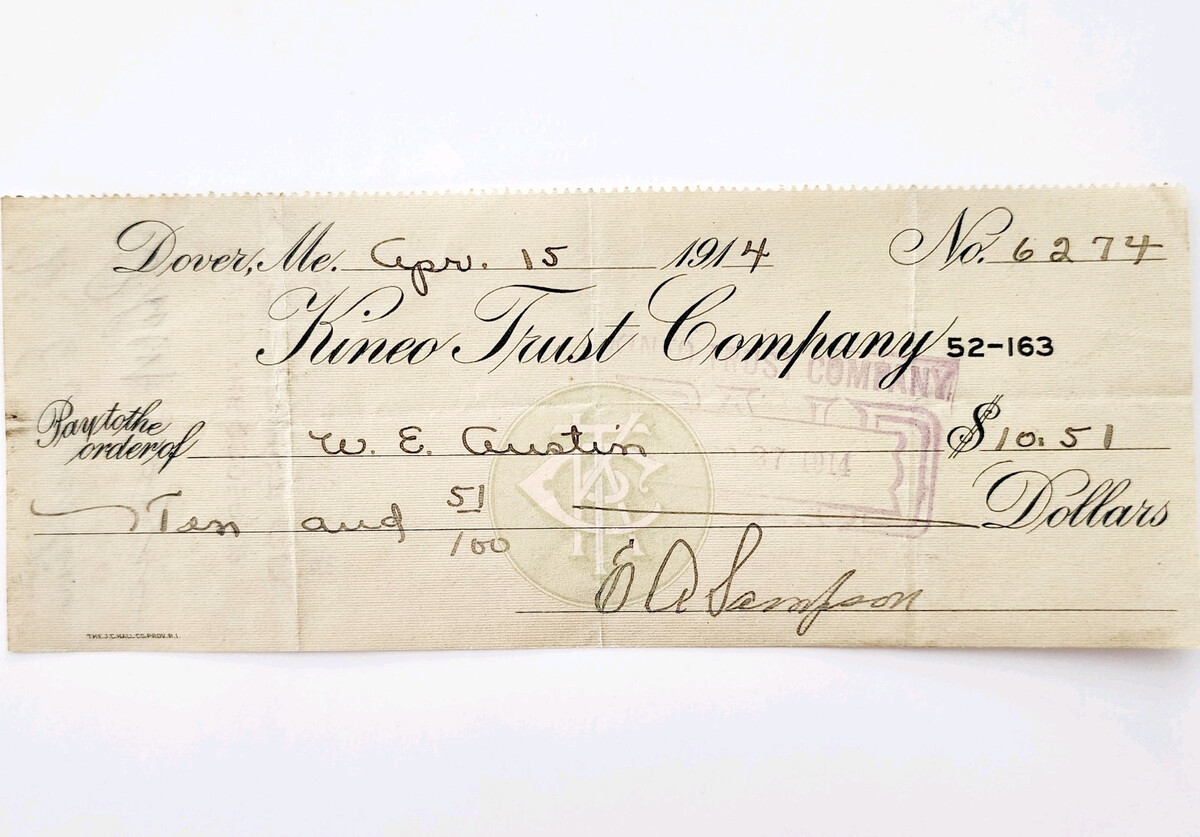 1914 Kineo Trust Company Bank Check E.A. Sampson Dover Maine Signed 6274 CHX12