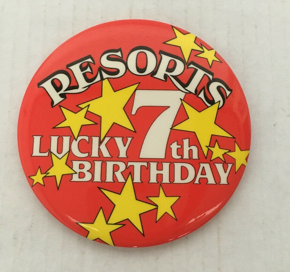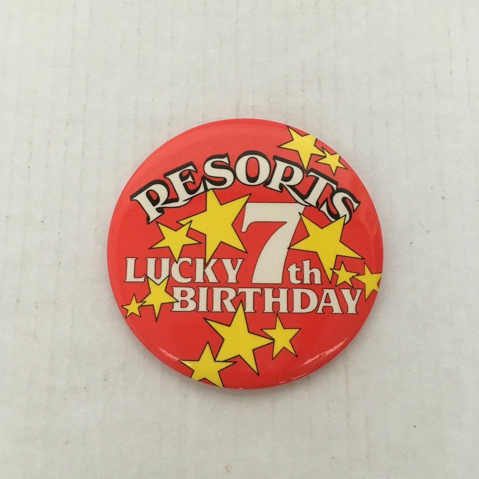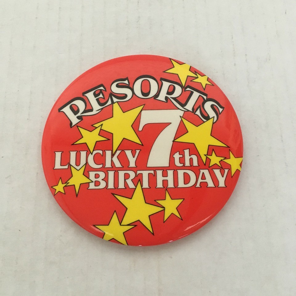 Vintage promo item Resorts casino large pin back button Lucky 7th birthday AC