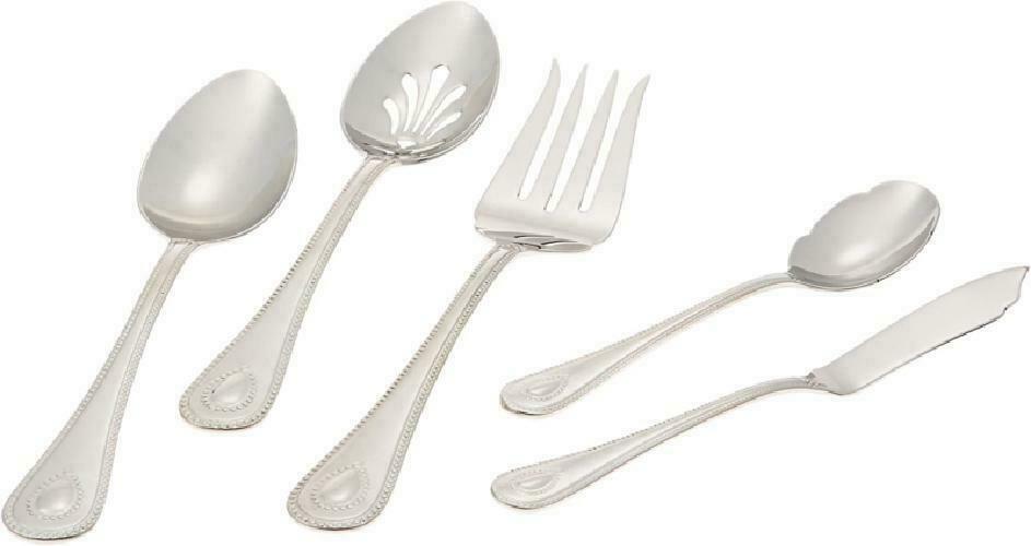 Crafted of 18/10 stainless steel, this 65-piece flatware set features a gentle teardrop shape at the bottom of the handles, decorated with dainty beading for an elegant look, and is ideal for upscale dining with treasured guests. This set includes at twelve dinner forks, twelve dinner knives, twelve salad forks, twelve tablespoons, twelve teaspoons, one serving spoon, one serving fork, one pierced serving spoon, one sugar spoon, and one butter knife.