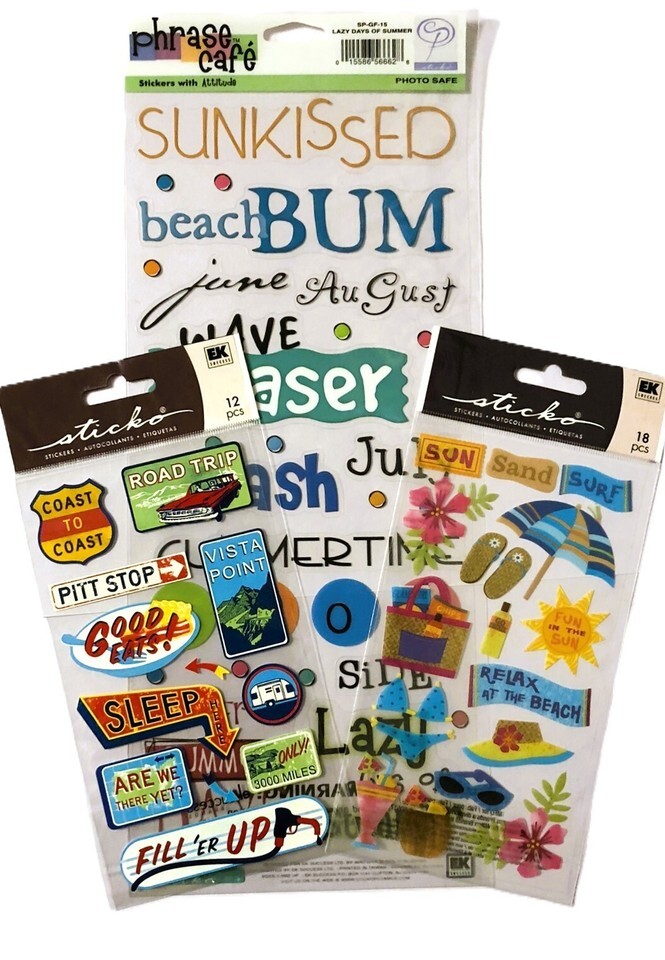 Scrapbooking Stickers Beach Vacation Set 3 Pack Lot Embellishments Sticko Phrase Cafe. Stickers are still in original packaging, stickers may show minor wear from storage. I do have more stickers, and combined shipping is added in cart when you purchase multiple items from my shop.