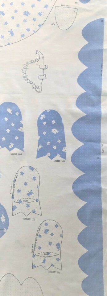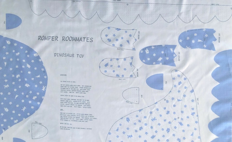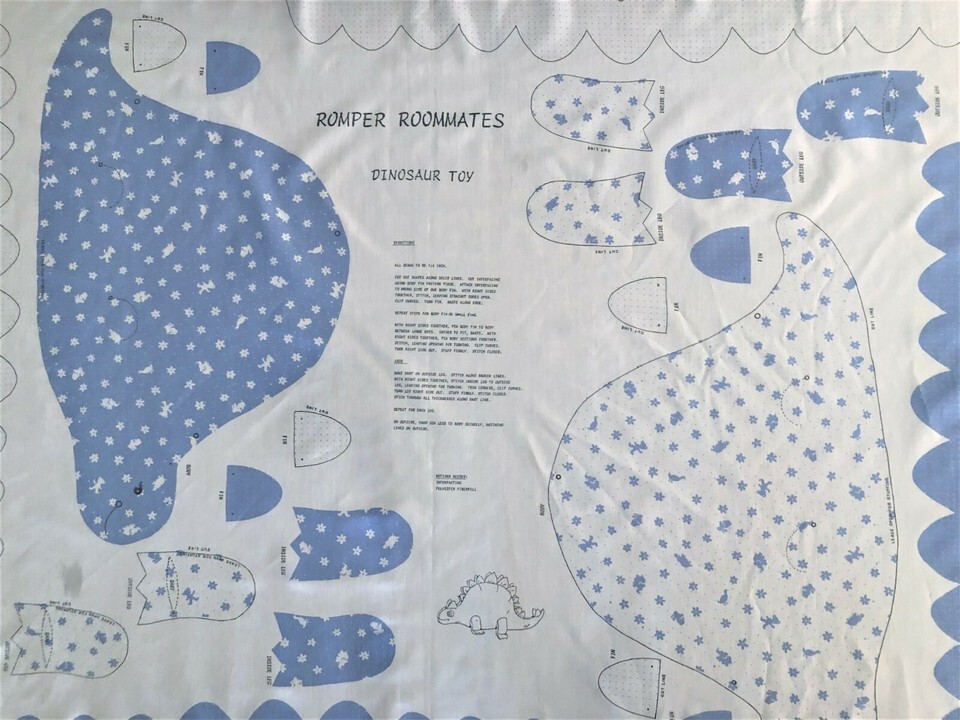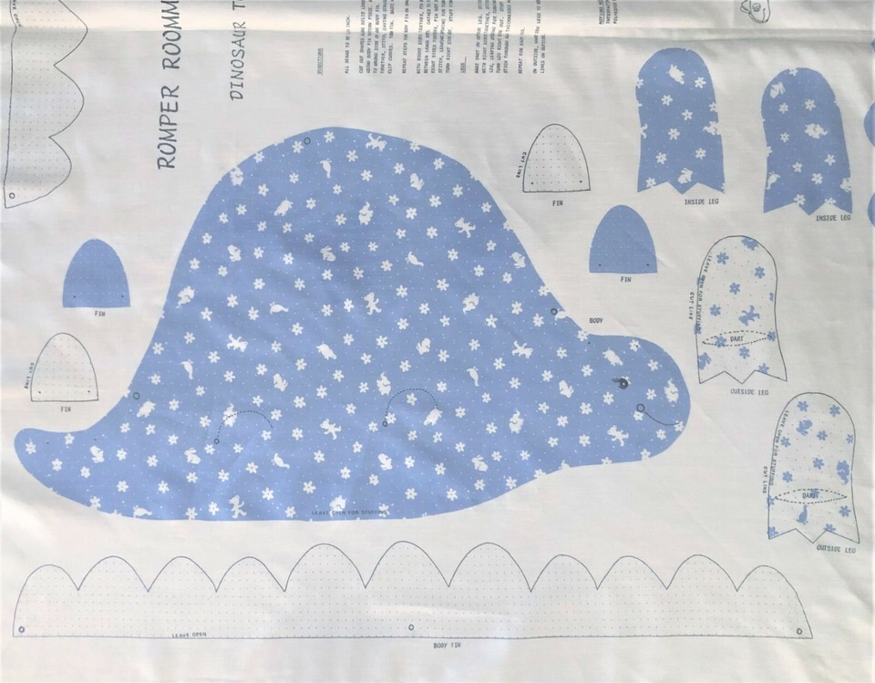 The fabric is used to make a dinosaur plush toy or pillow for kids. The fabric has the cut out pieces and directions all in one. The fabric has been pre-washed. I believe the fabric is a cotton/poly blend light weight fabric. The completed toy measures 13 inches tall by 22 inches from head to tail. You will get a full pattern set, plus an extra set that has a small stain on it. I have more material at my store and offer combined shipping when you buy more, combined shipping is added to cart.