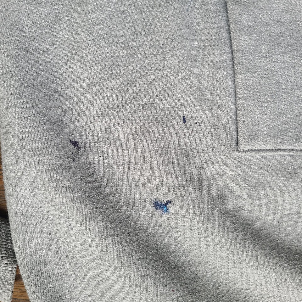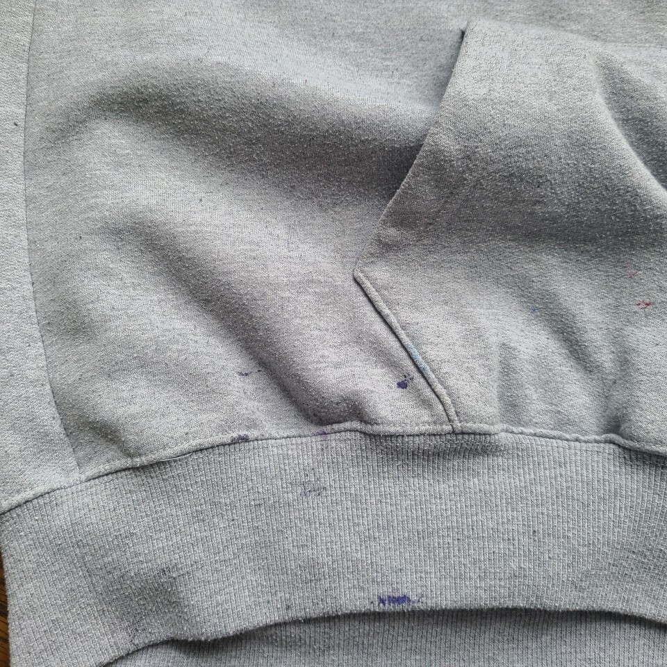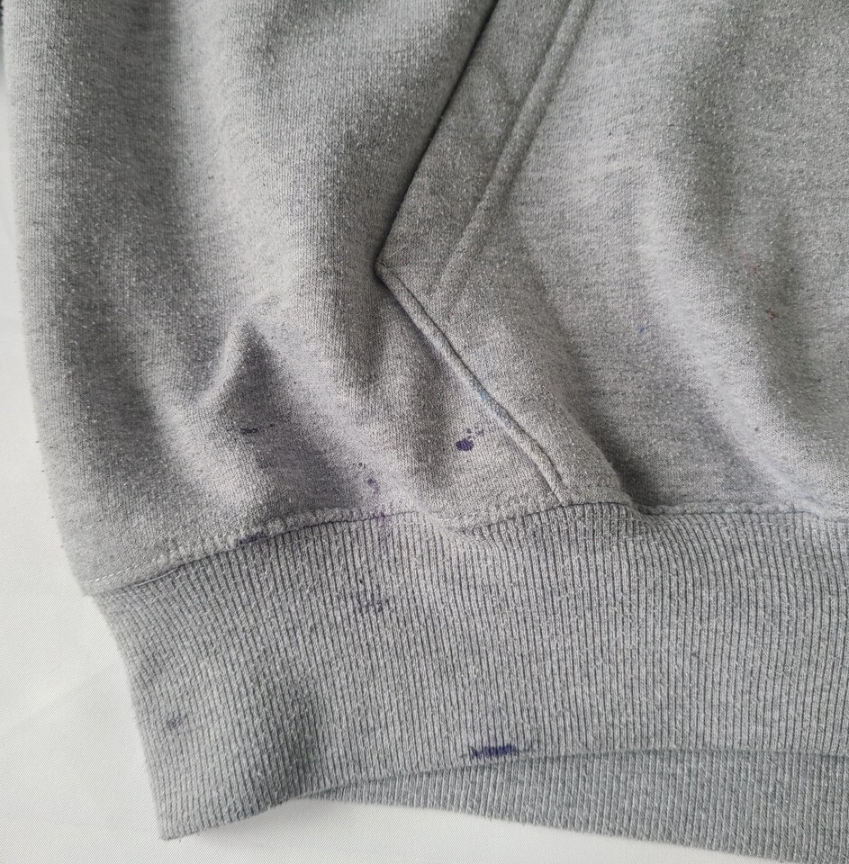 There is splattered multi-color paint throughout the hoodie (mostly on the sleeves). There is NO drawstring, buyer can replace on their own after receiving the item if they choose to. Pilling throughout the hoodie. All flaws are photographed. PLEASE VIEW ALL PHOTOS!!