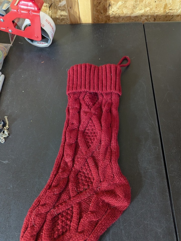 This is an 18" red knitted Christmas stocking in a solid pattern, shaped like a sock. With a festive holiday theme, it features a stocking character and is made of cotton material. It is large in size, measuring 18" in height and 5" in length, perfect for hanging by the fireplace or on a mantel during the holiday season.