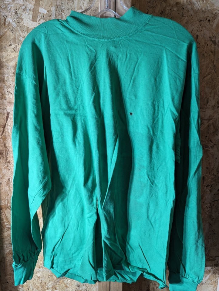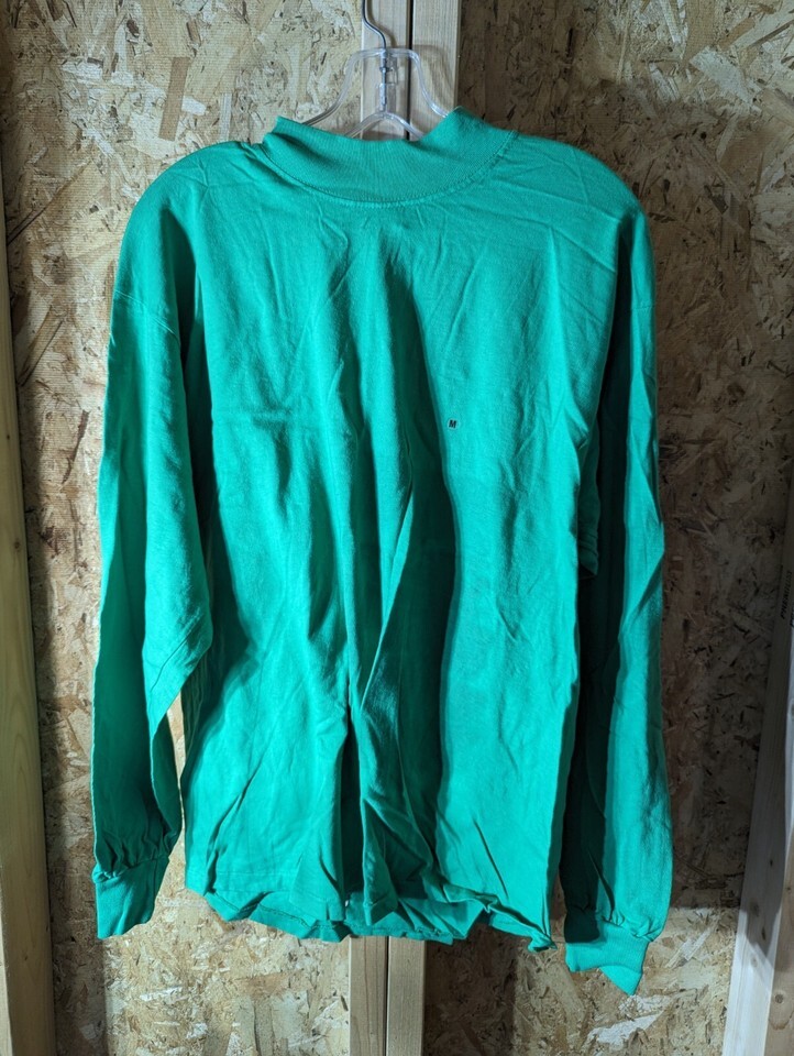 This is a vintage Gap sweatshirt made of 100% cotton knit fabric in green color. It has a high neckline and long sleeves, making it suitable for winter, fall, and spring seasons. The sweatshirt is a pullover style and has a solid pattern. It is machine washable and available in men's medium size.