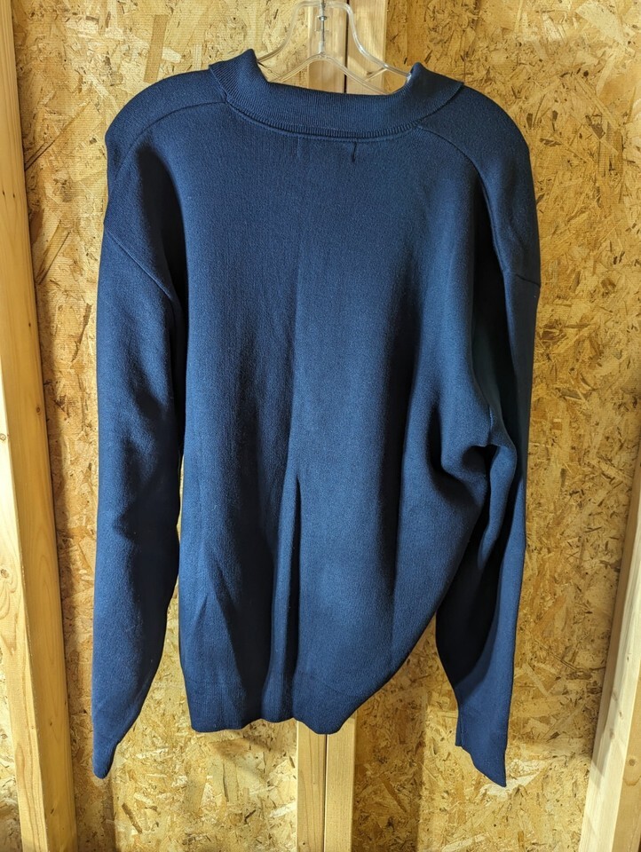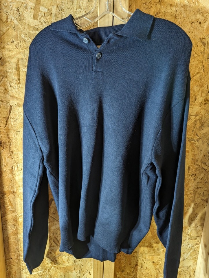 This is a blue, collared sweater made of tight-knit cotton fabric with long sleeves. It is a pullover style sweater with a solid pattern and is machine washable. The brand is Cypress Links and it is a medium size sweater for men. It is suitable for golfing activities.