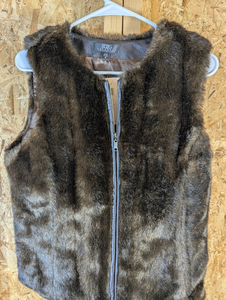 This is a BCBGMAXAZRIA faux fur vest in size medium. It features a brown color with a softshell fabric type and a cotton blend lining. The vest has a solid pattern, a short length, and a zip closure. It is suitable for winter, fall, and spring seasons. The vest is lined and has a full zip.