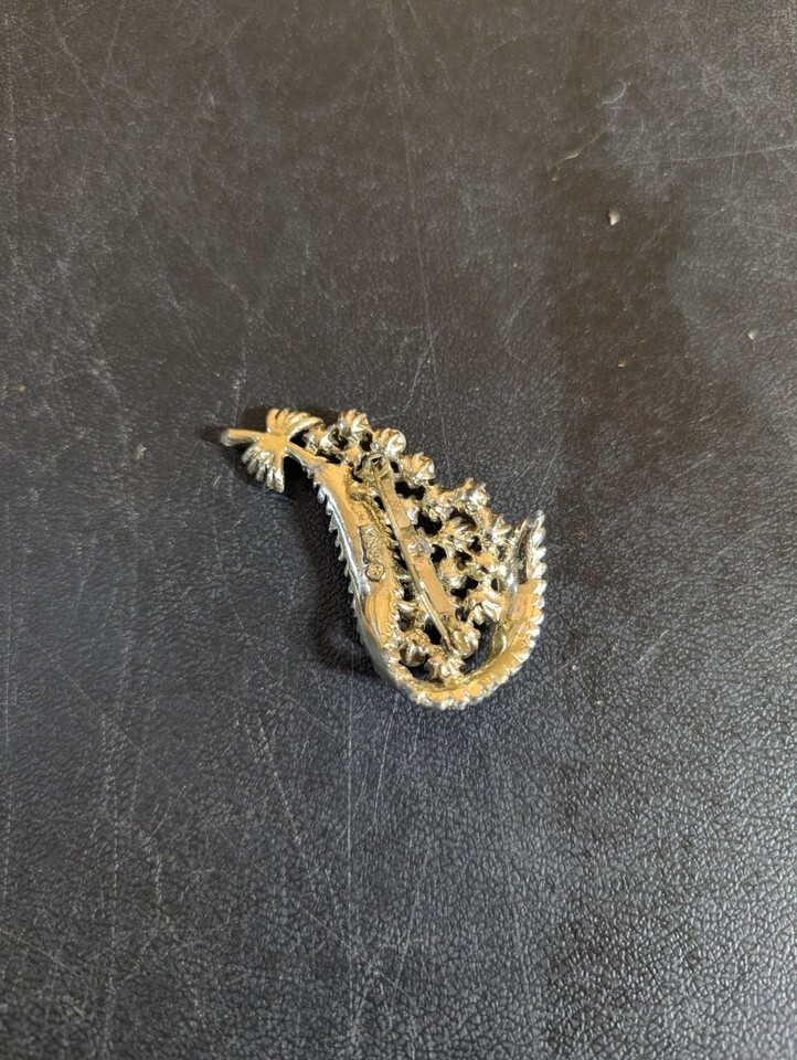 The BSK Silvertone and Faux Pearl Brooch is a vintage piece with a wing shape design, featuring a round imitation pearl as the main stone. The brooch is crafted in a silver color, measuring 2.5" in length. With its original vintage charm, this piece is perfect for any occasion, adding a touch of elegance and whimsy to any outfit.