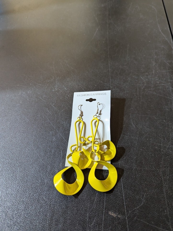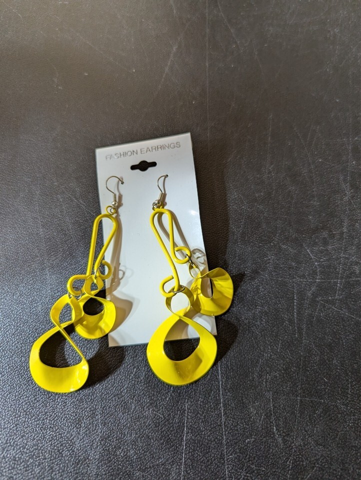Add a pop of color to your outfit with these fashionable yellow swirl earrings. Made from metal, the earrings feature a unique shape that is sure to catch the eye. The dangle/drop style adds a touch of elegance, making them perfect for any occasion. These earrings are not antique, vintage, or signed, but they are sure to make a statement. They are perfect for those who appreciate modern fashion jewelry.